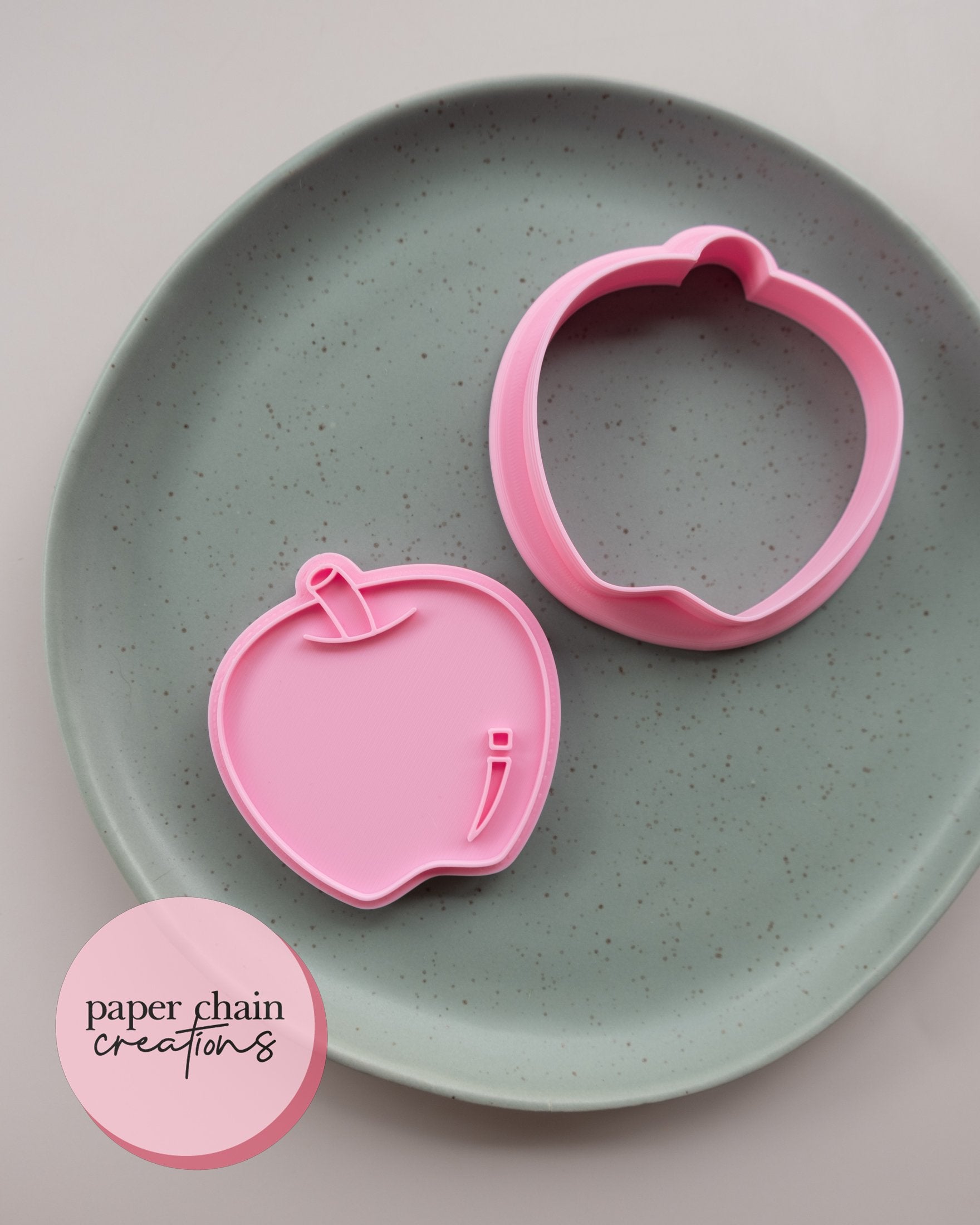 1 x Apple cookie cutter with matching embosser. Embosser comes with handle on the back for ease of use.