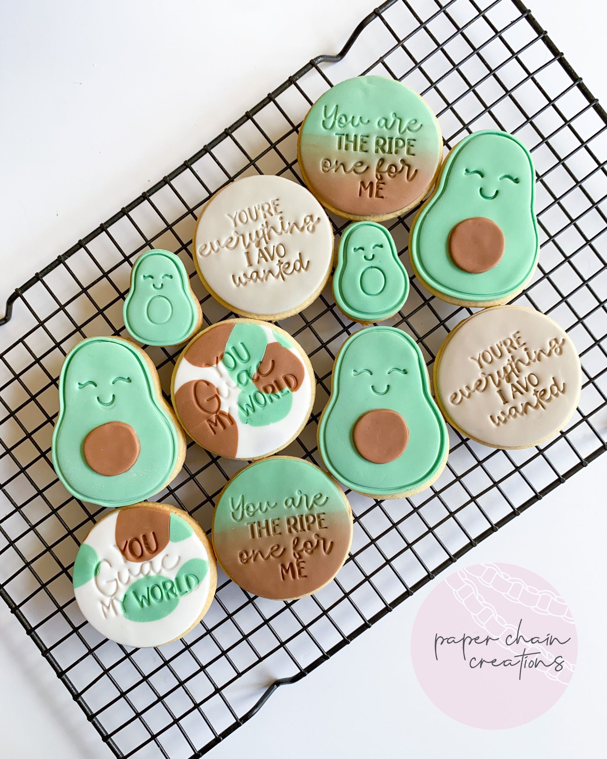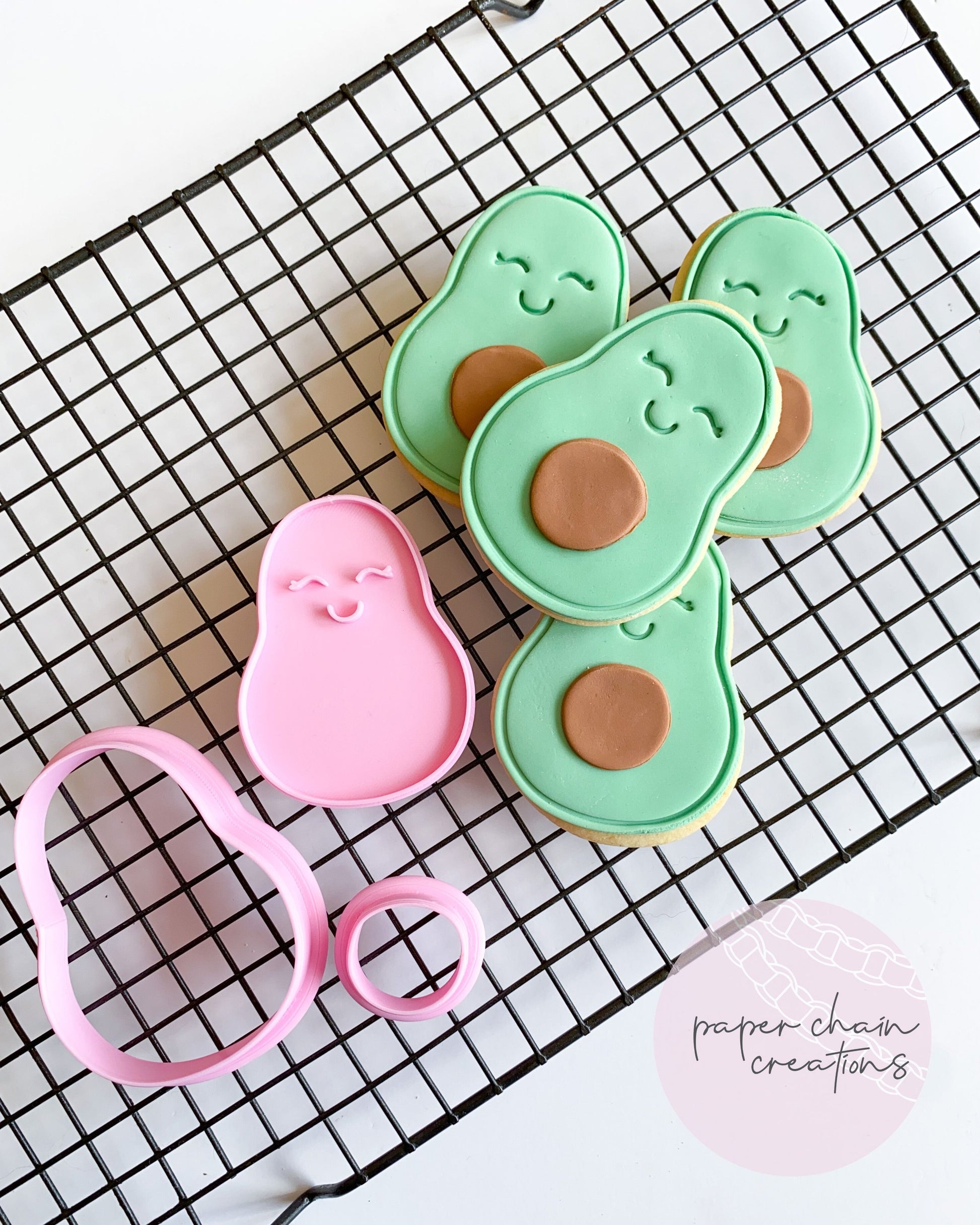 1 x Avocado cookie cutter with matching embosser and fondant cutter for the seed. Embosser comes with handle on the back for ease of use.