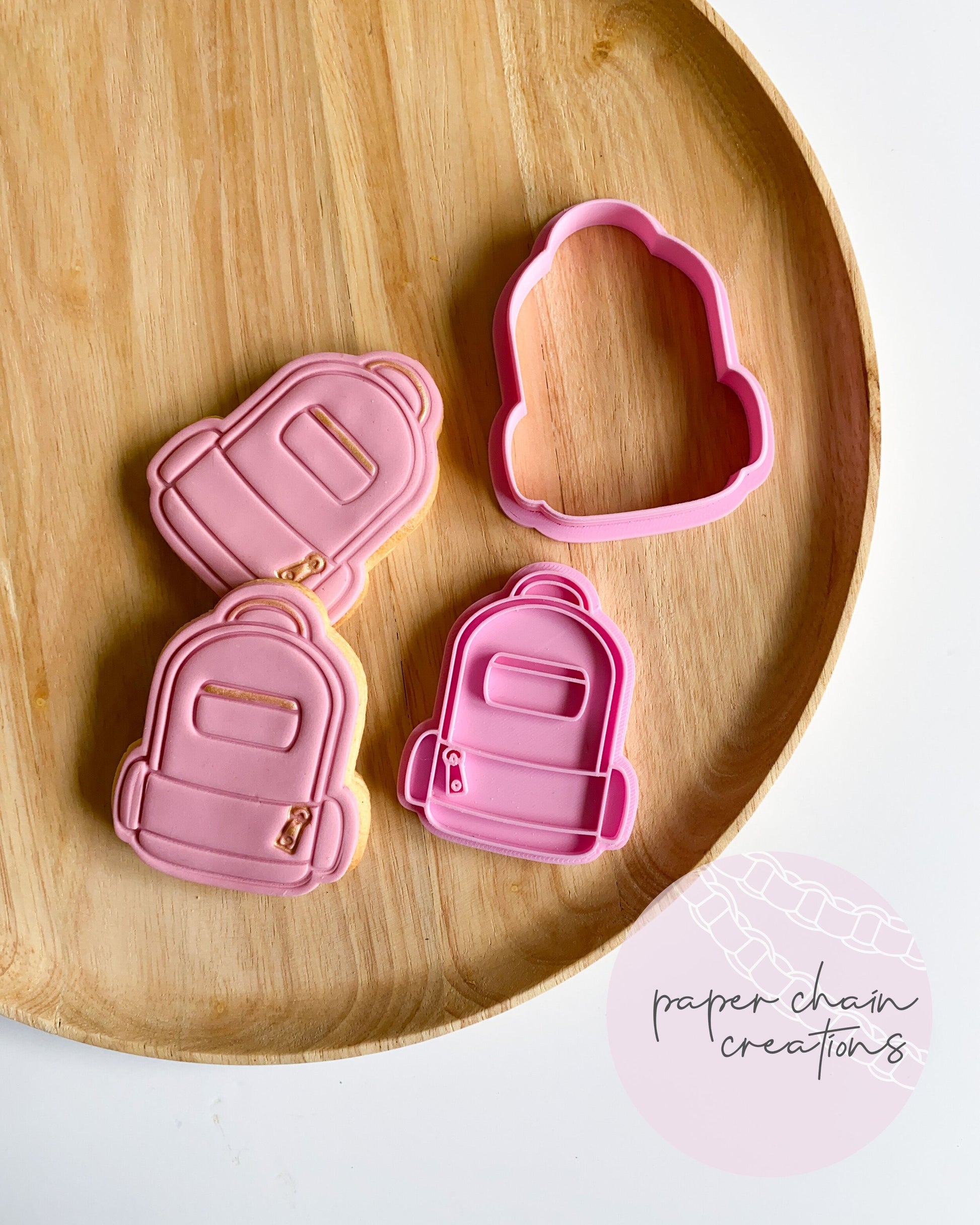 1 x backpack cookie cutter with matching embosser. Embosser comes with handle on the back for ease of use.