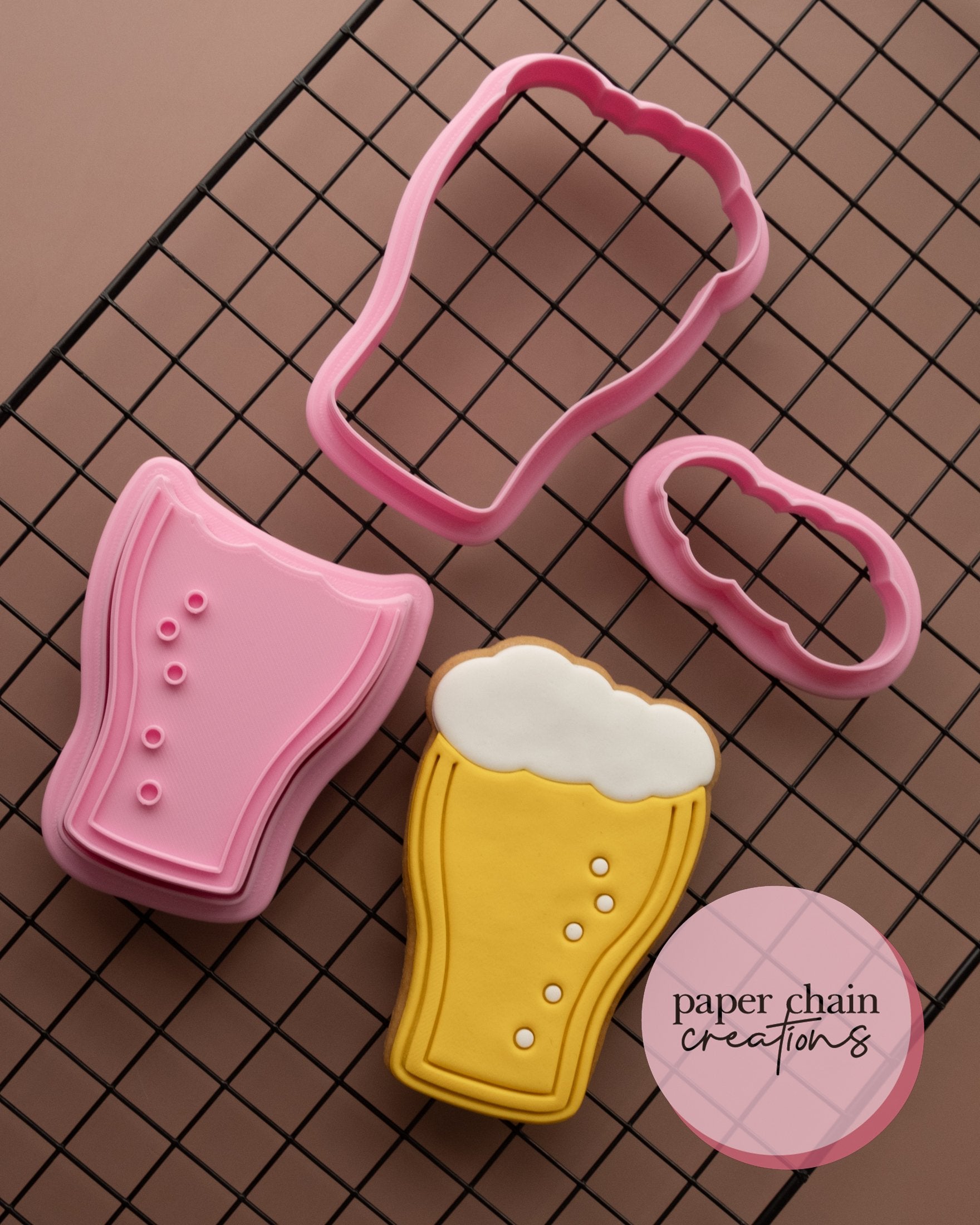 1 x Beer Glass outline cutter, 1 x base cutter, 1x froth cutter and 1 x Beer embosser. Embosser comes with handle on the back for ease of use.