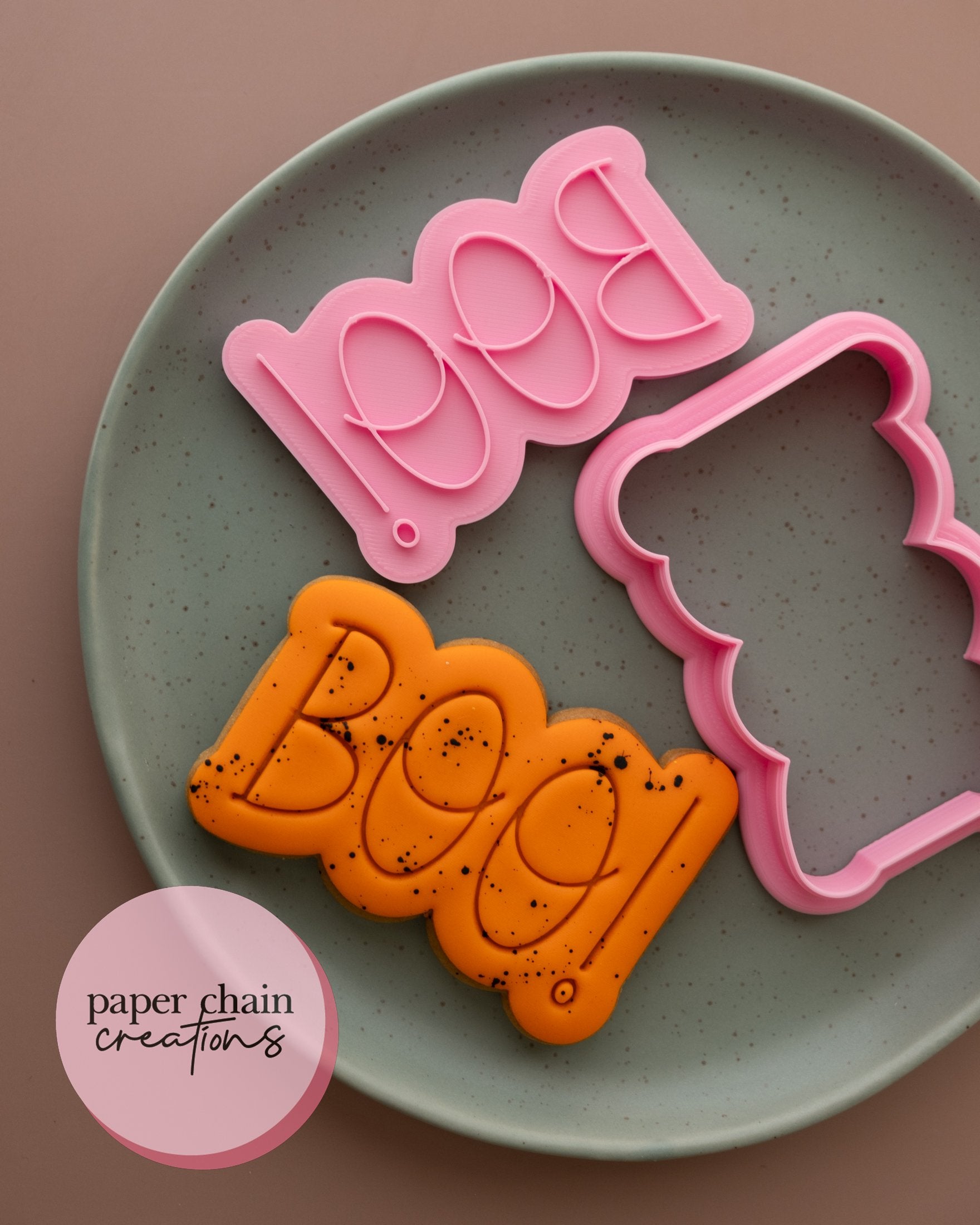 1 x Boo! cookie cutter with matching embosser. Embosser comes with handle on the back for ease of use.
