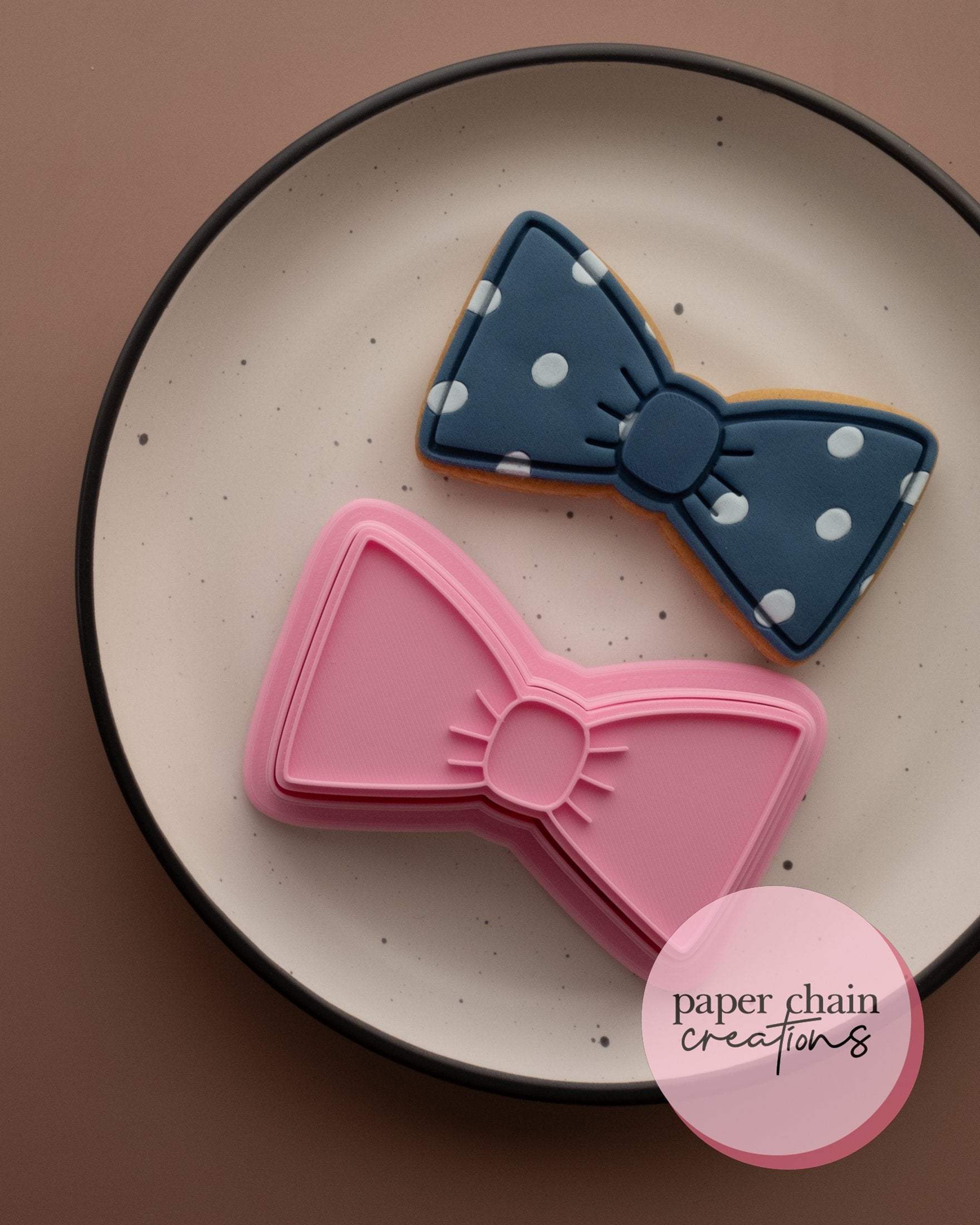 1 x Bow Tie Cookie Cutter with matching embosser. Embosser comes with handle on the back for ease of use.