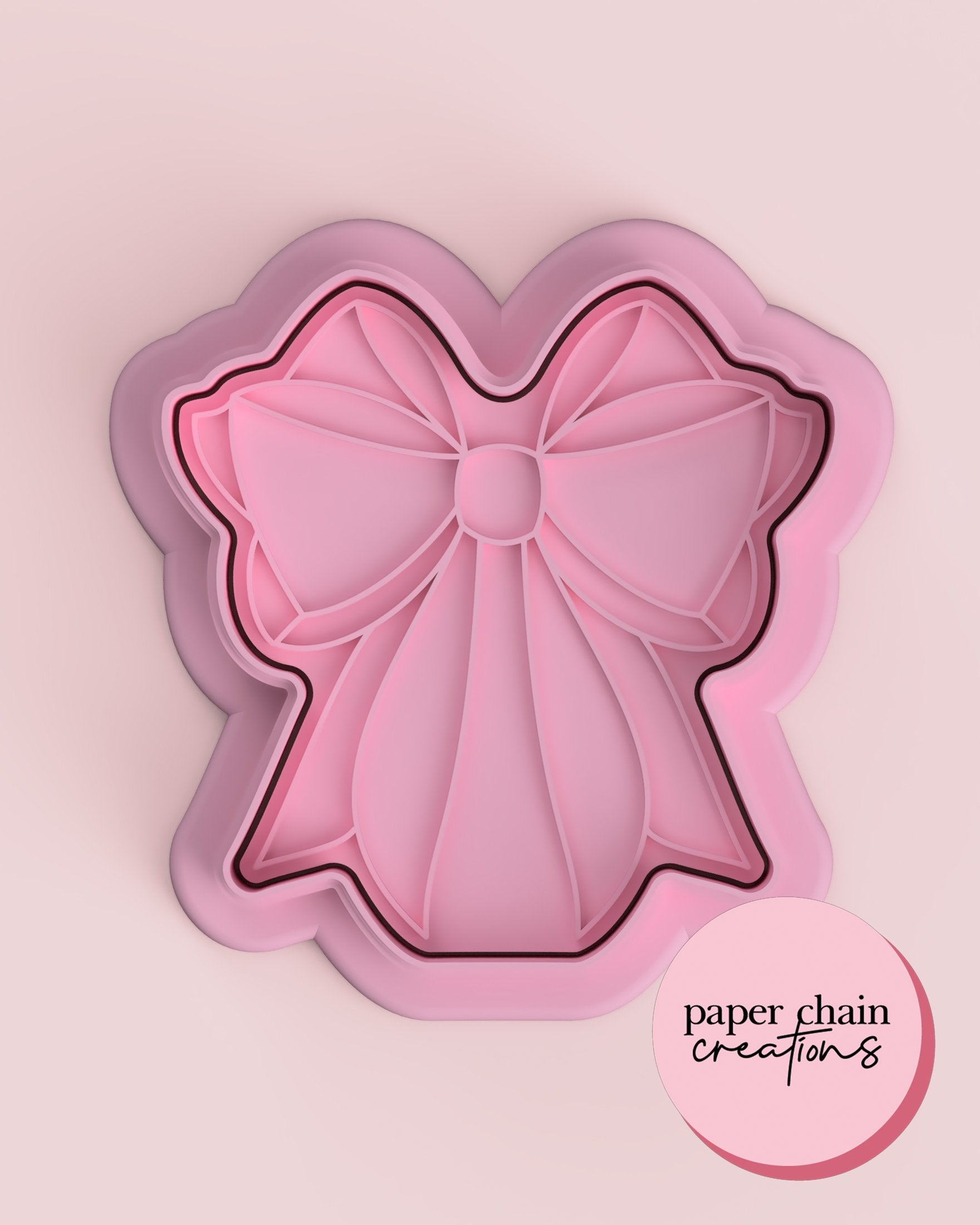 1 x Bow V3 Cookie Cutter with matching embosser. Embosser comes with handle on the back for ease of use.