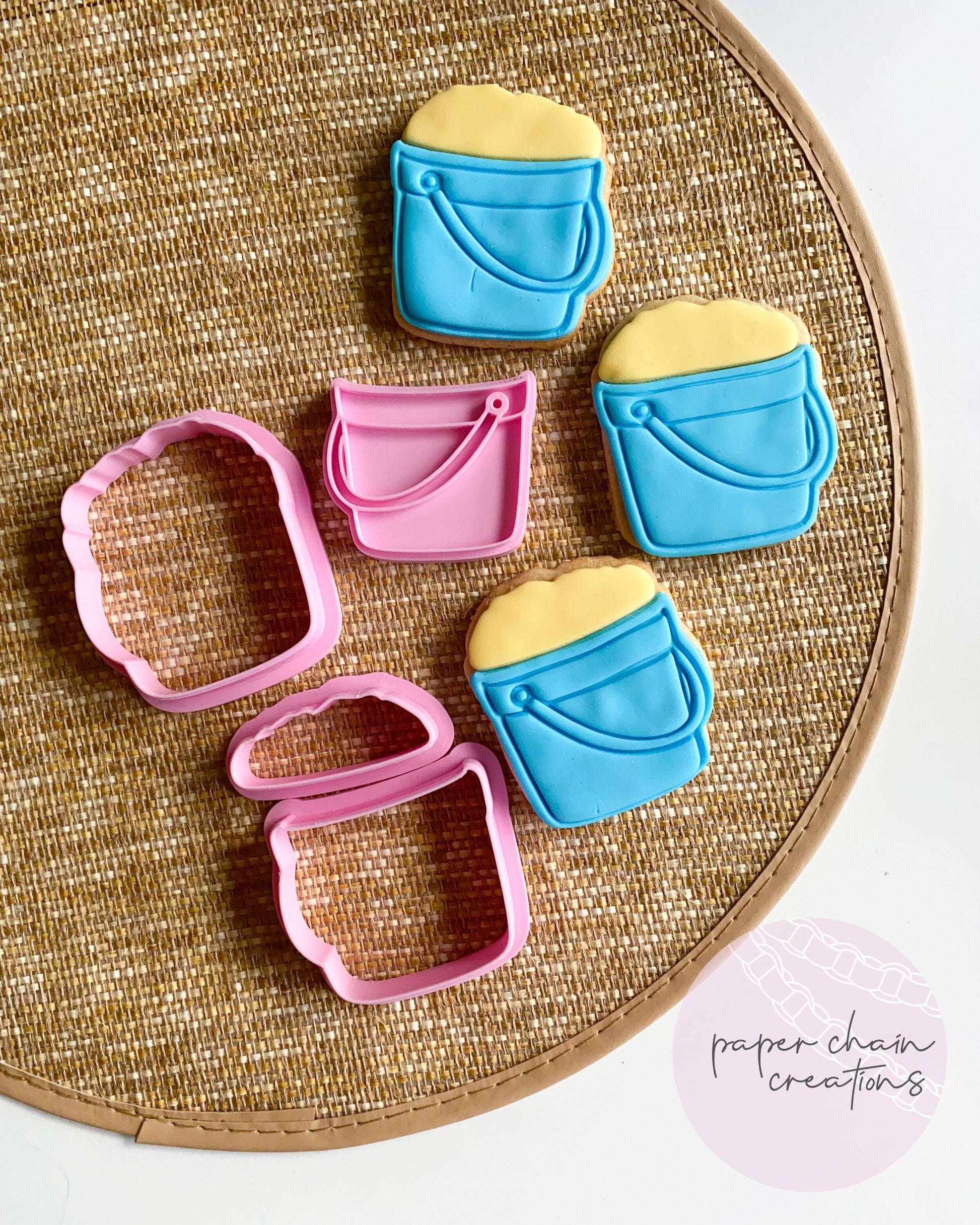 1 x Bucket of Sand cookie cutter with 2 x cookie cutters and a matching bucket embosser. Embosser comes with handle on the back for ease of use.