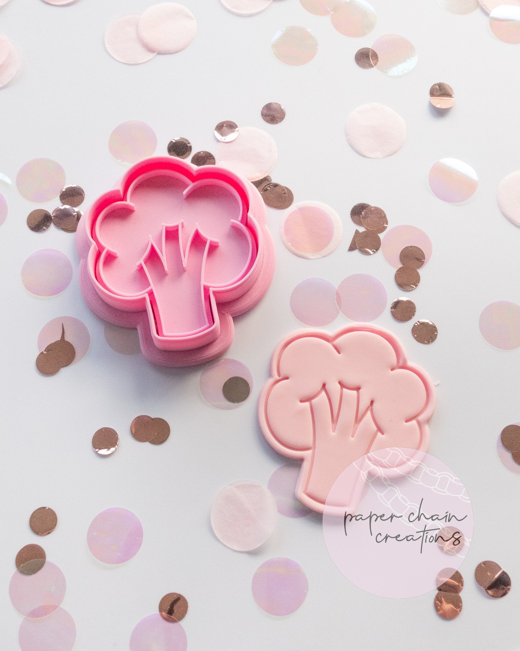 1 x Broccoli cookie cutter with matching embosser. Embosser comes with handle on the back for ease of use.