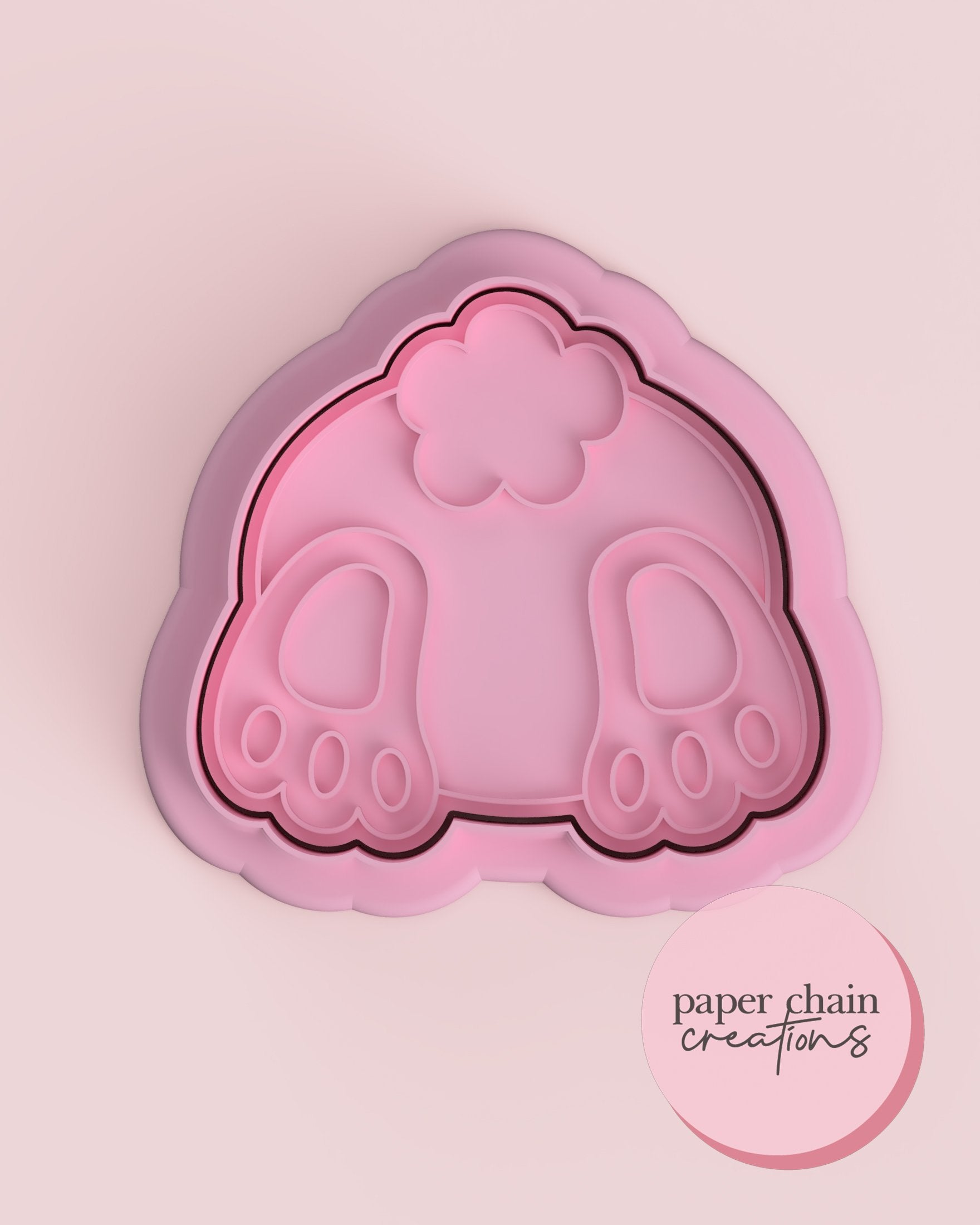 1 x Bunny Bum Cookie Cutter with matching embosser. Embosser comes with handle on the back for ease of use.