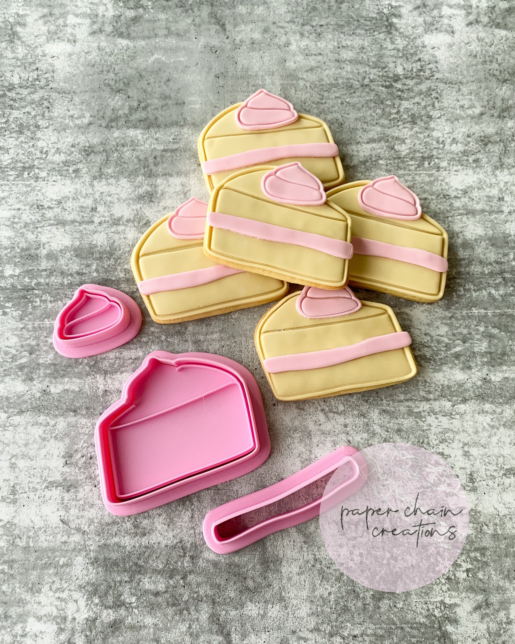 1 x Cake Slice outline cookie cutter with matching embosser. 1 x Frosting swirl cookie cutter with matching embosser and 1 x cake filling cookie cutter.. Embossers comes with handle on the back for ease of use.