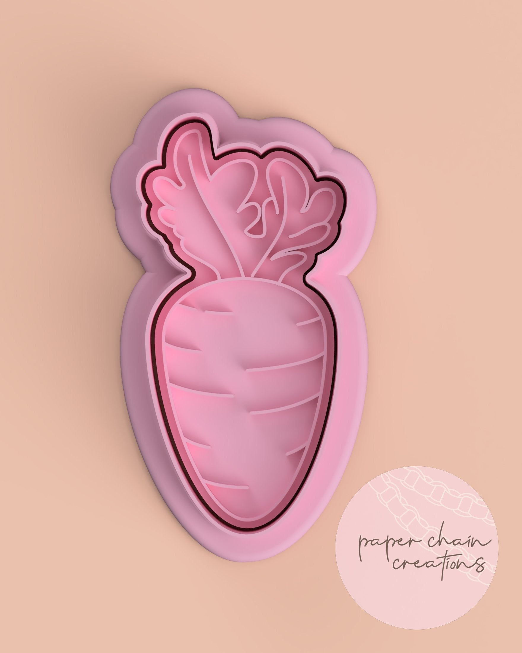 1 x Carrot V2 Cookie Cutter with matching embosser. Embosser comes with handle on the back for ease of use.