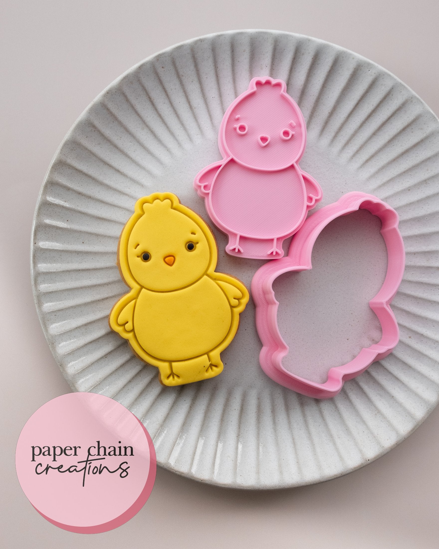 1 x Chick Cookie Cutter with matching embosser. Embosser comes with handle on the back for ease of use.