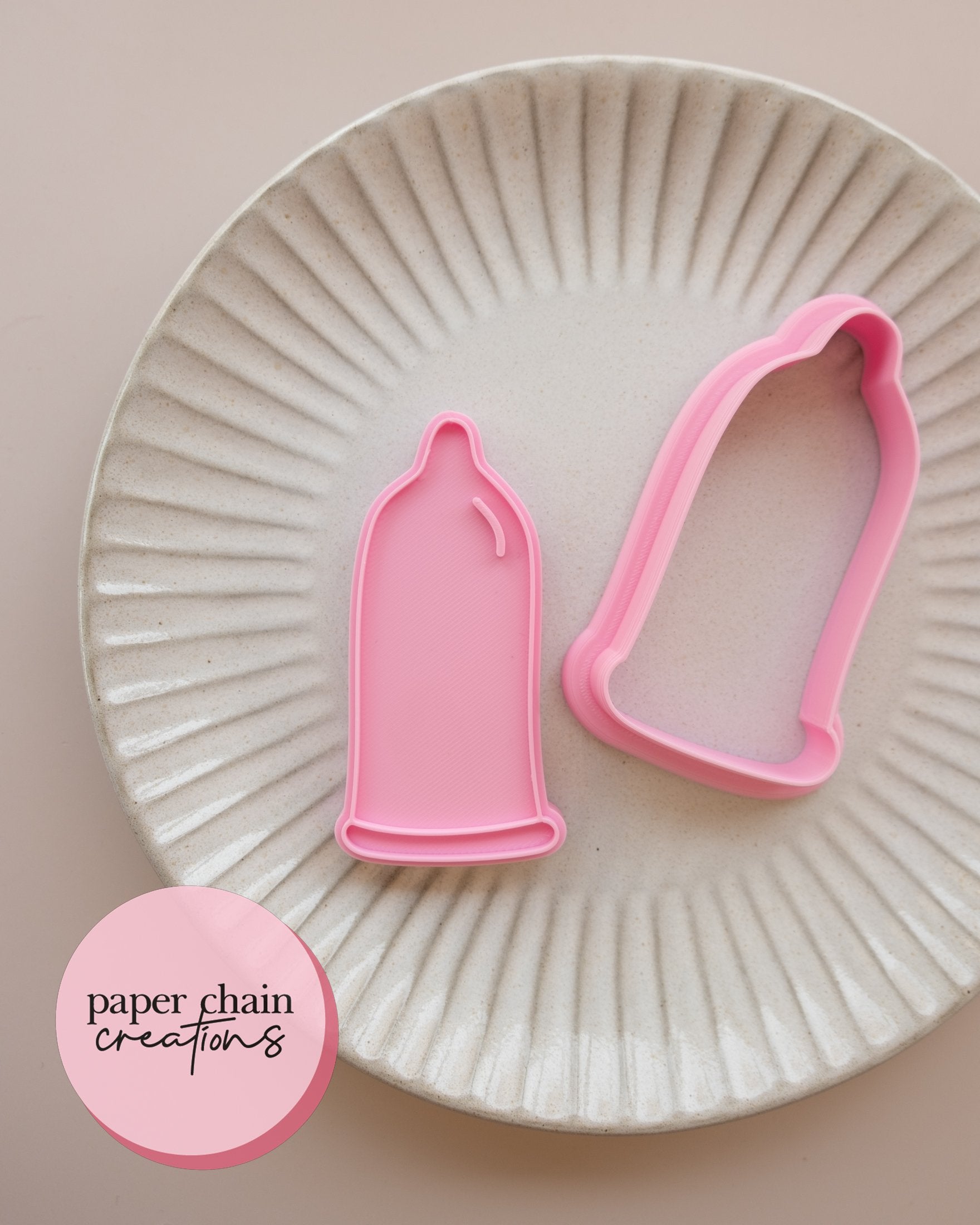 1 x Condom Cookie Cutter with matching embosser. Embosser comes with handle on the back for ease of use.