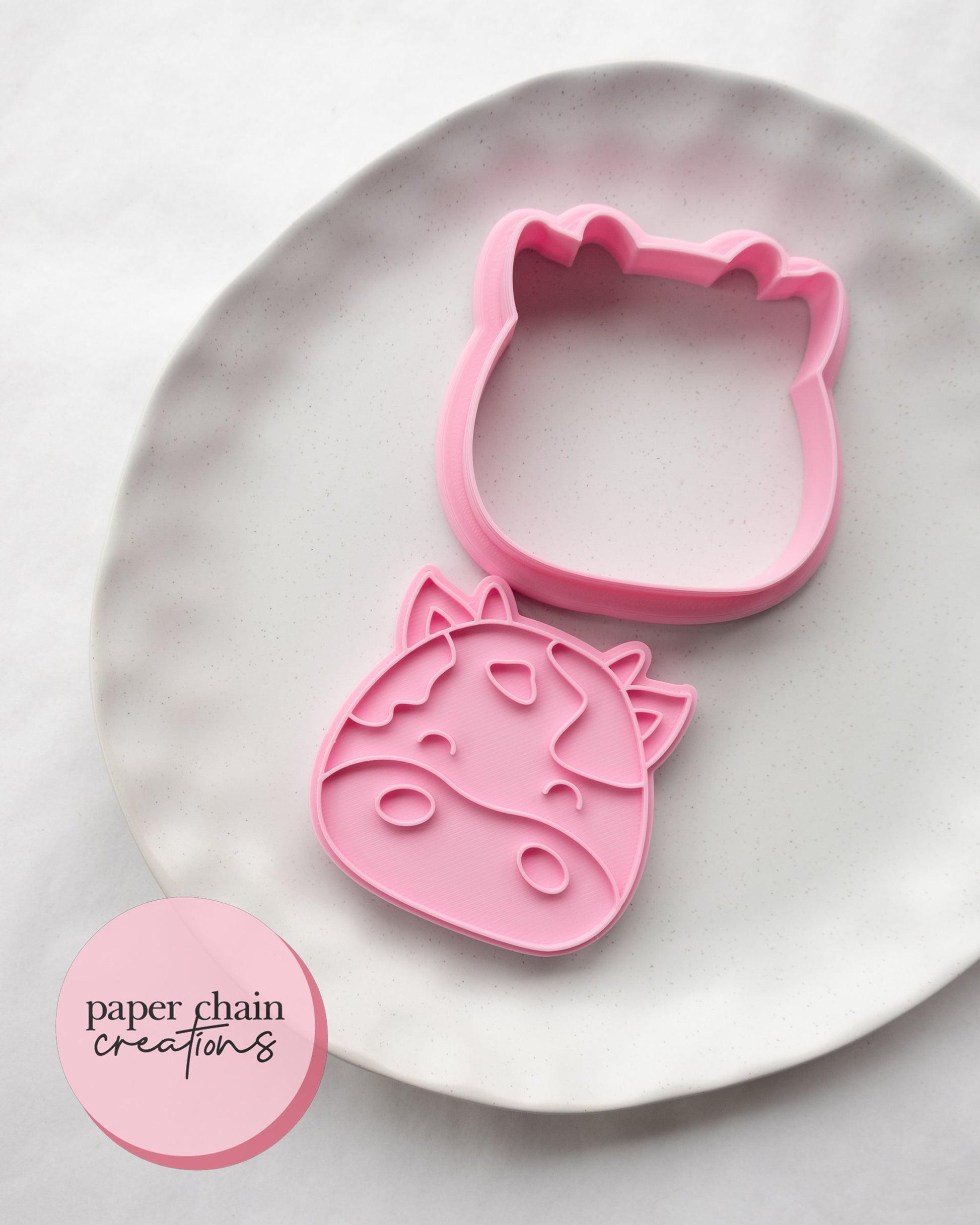 1 x Cow Face Cookie Cutter with matching embosser. Embosser comes with handle on the back for ease of use.