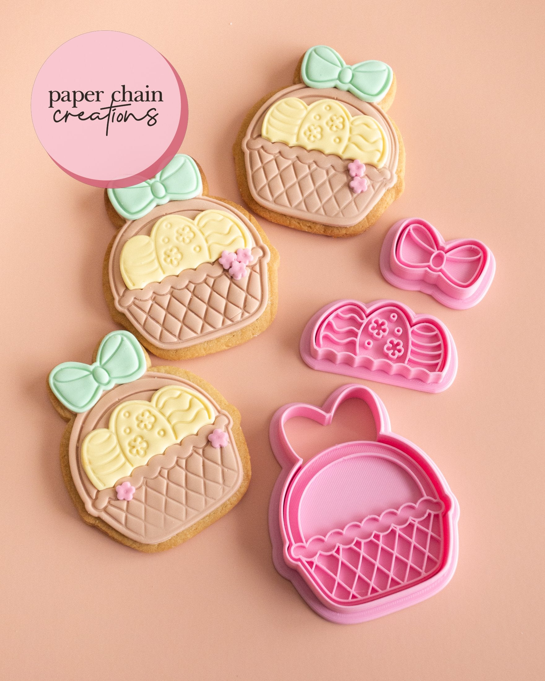 1 x Basket outline cookie cutter, 3 x fondant embossers and 2 x matching cutters. Embosser comes with handle on the back for ease of use.