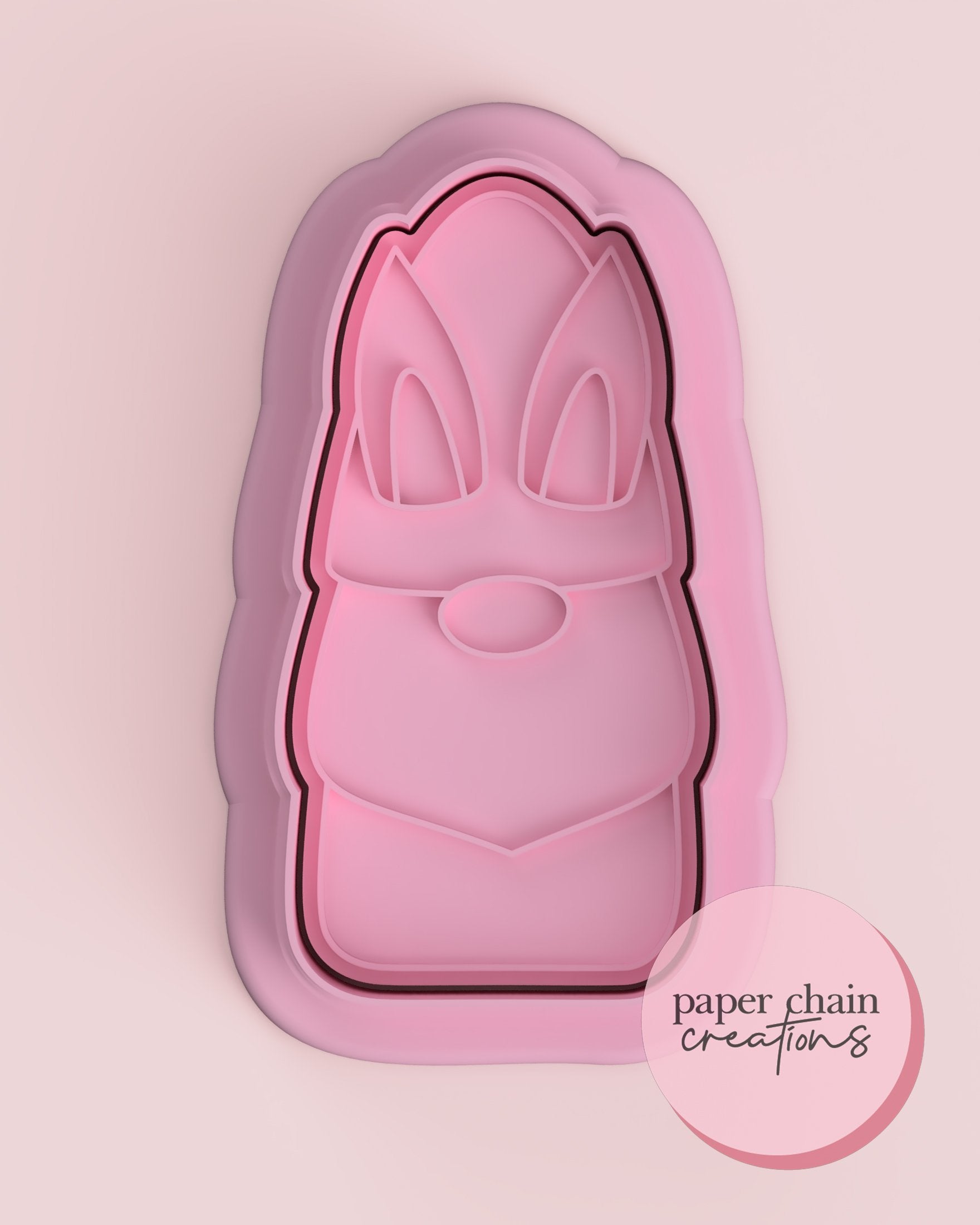 1 x Easter gnome cookie cutter with matching embosser. Embosser comes with handle on the back for ease of use.