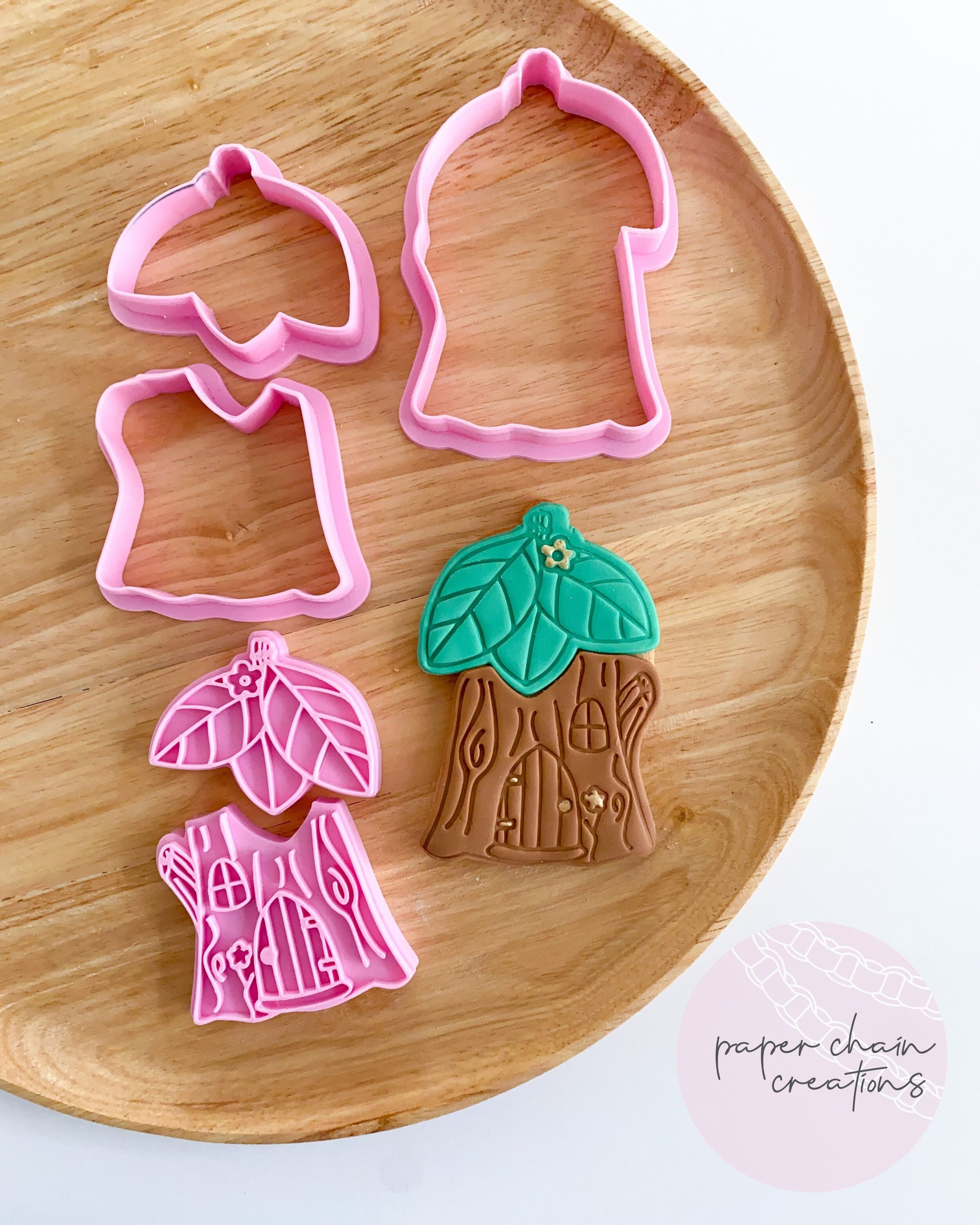 1 x fairy house outline cookie cutter, 2 x fairy house embossers with matching cutters. Embosser comes with handle on the back for ease of use.