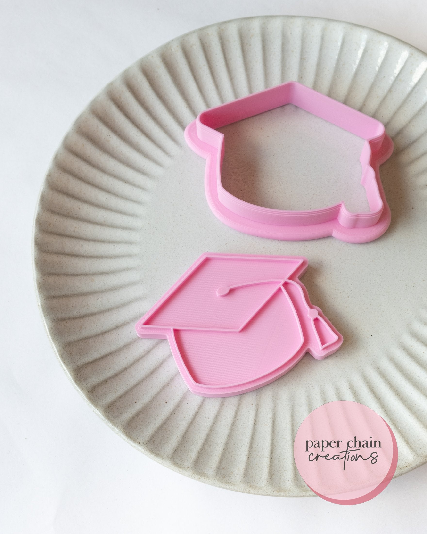 1 x Graduation cap cookie cutter with matching embosser. Embosser comes with handle on the back for ease of use.