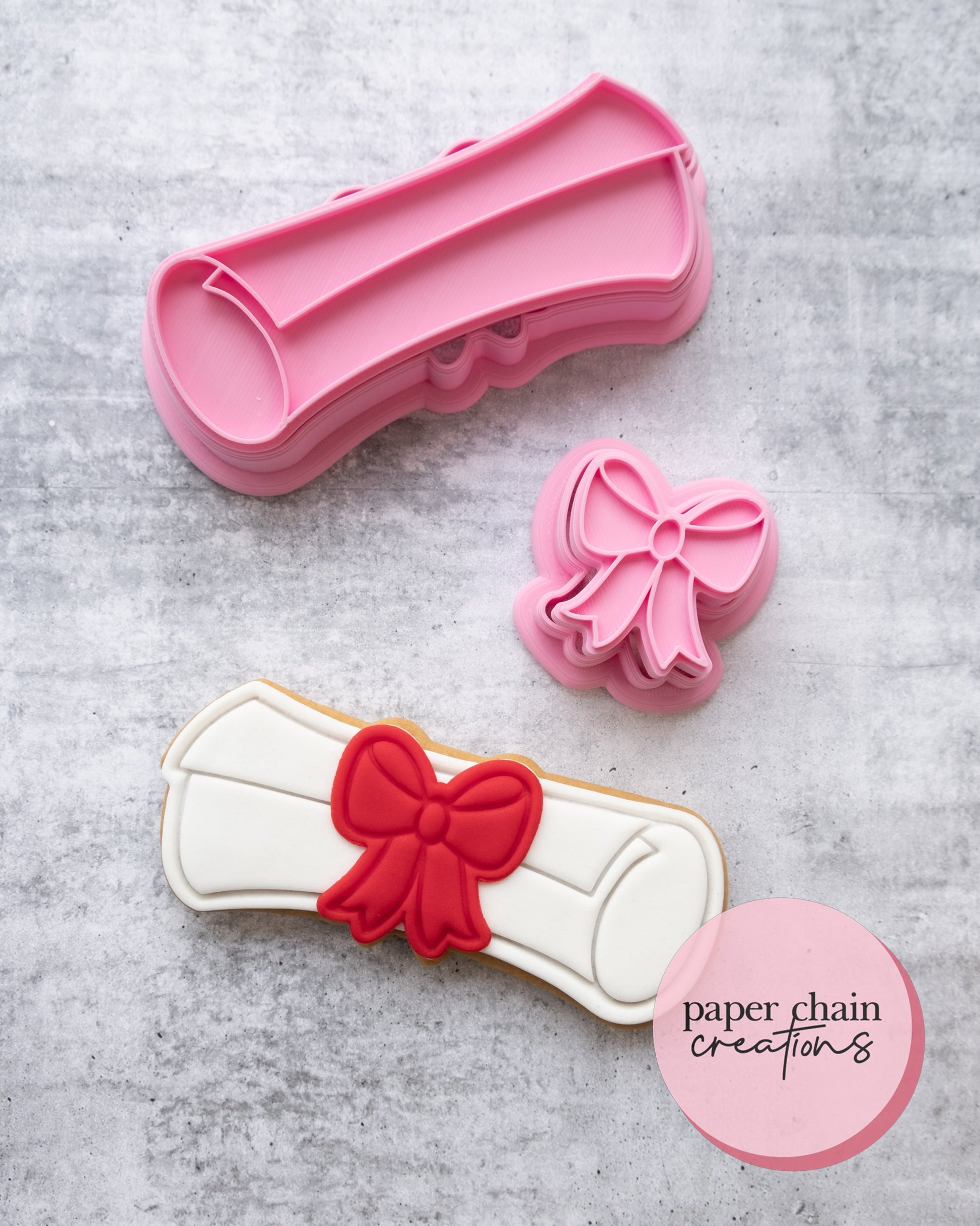 1 x Graduation Diploma cookie cutter with matching embosser and 1 x bow cookie cutter and matching embosser. Embosser comes with handle on the back for ease of use.