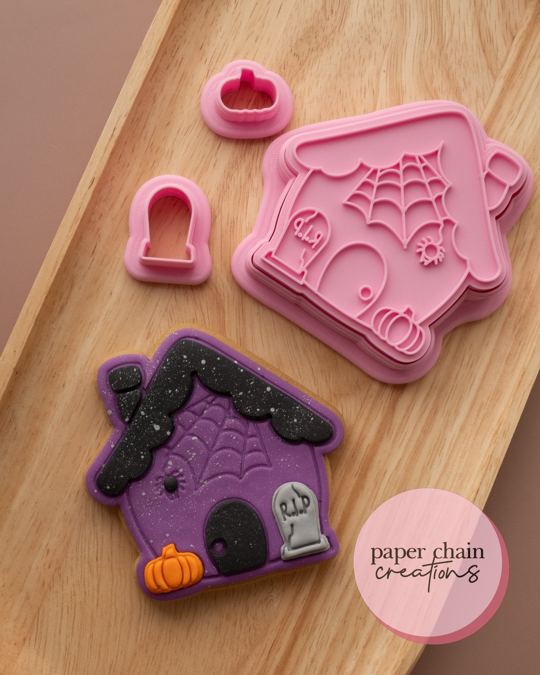 1 x Halloween Gingerbread House Cookie Cutter with matching embosser 2 x cutters for spooky embellishments. Embosser comes with handle on the back for ease of use.