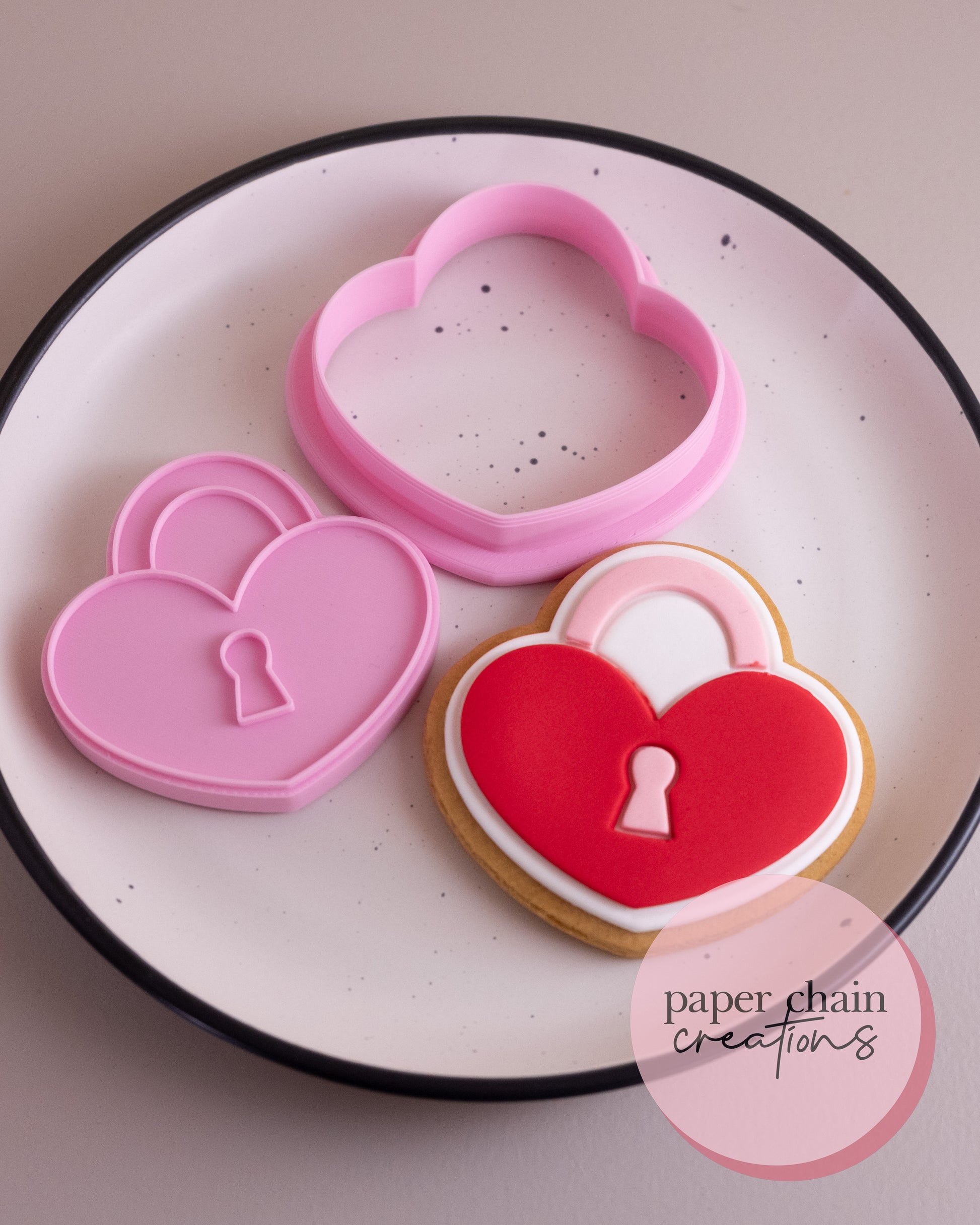 1 x Heart Lock cookie cutter with matching embosser. Embosser comes with handle on the back for ease of use.