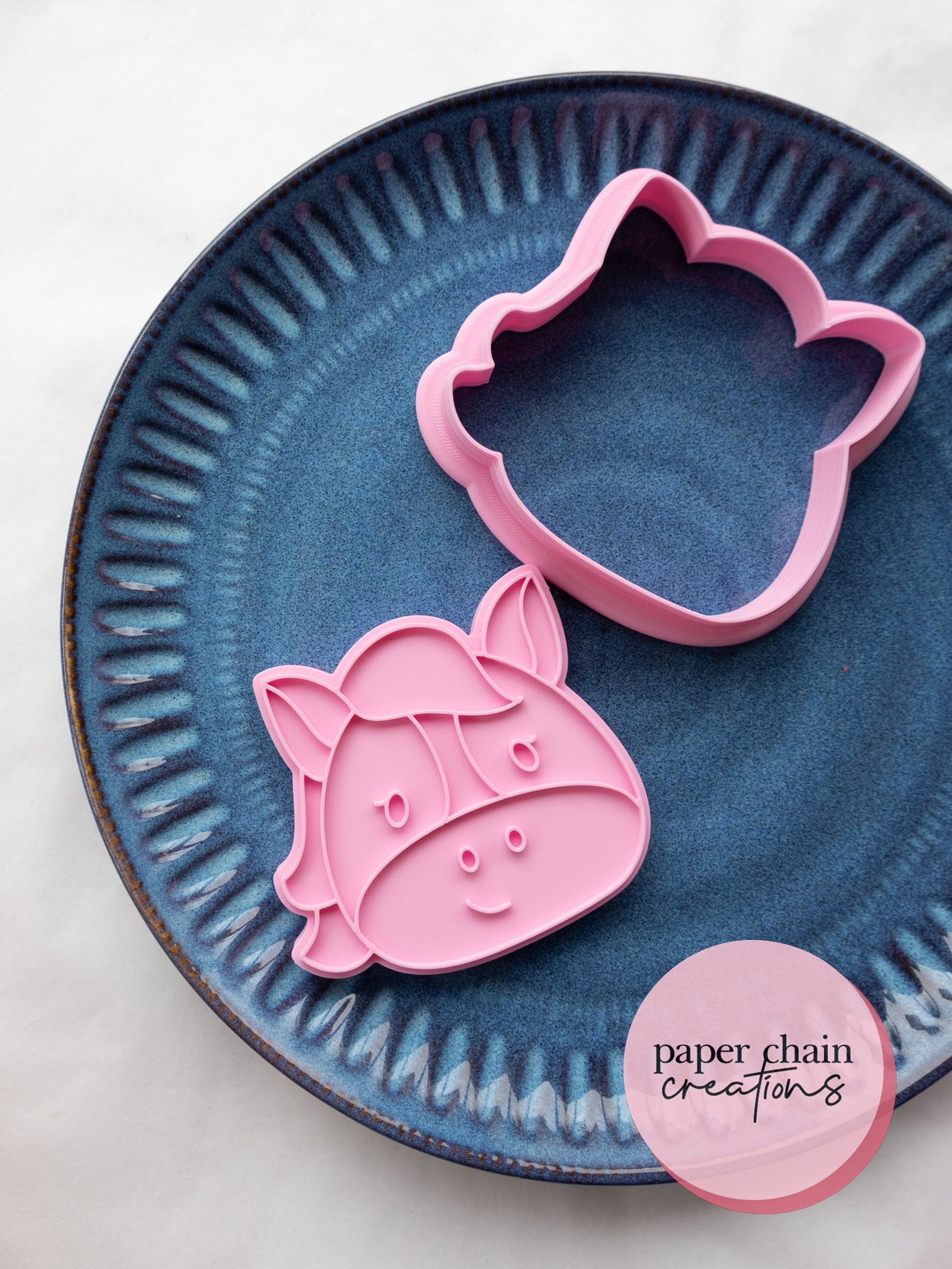 1 x Horse Face Cookie Cutter with matching embosser. Embosser comes with handle on the back for ease of use.