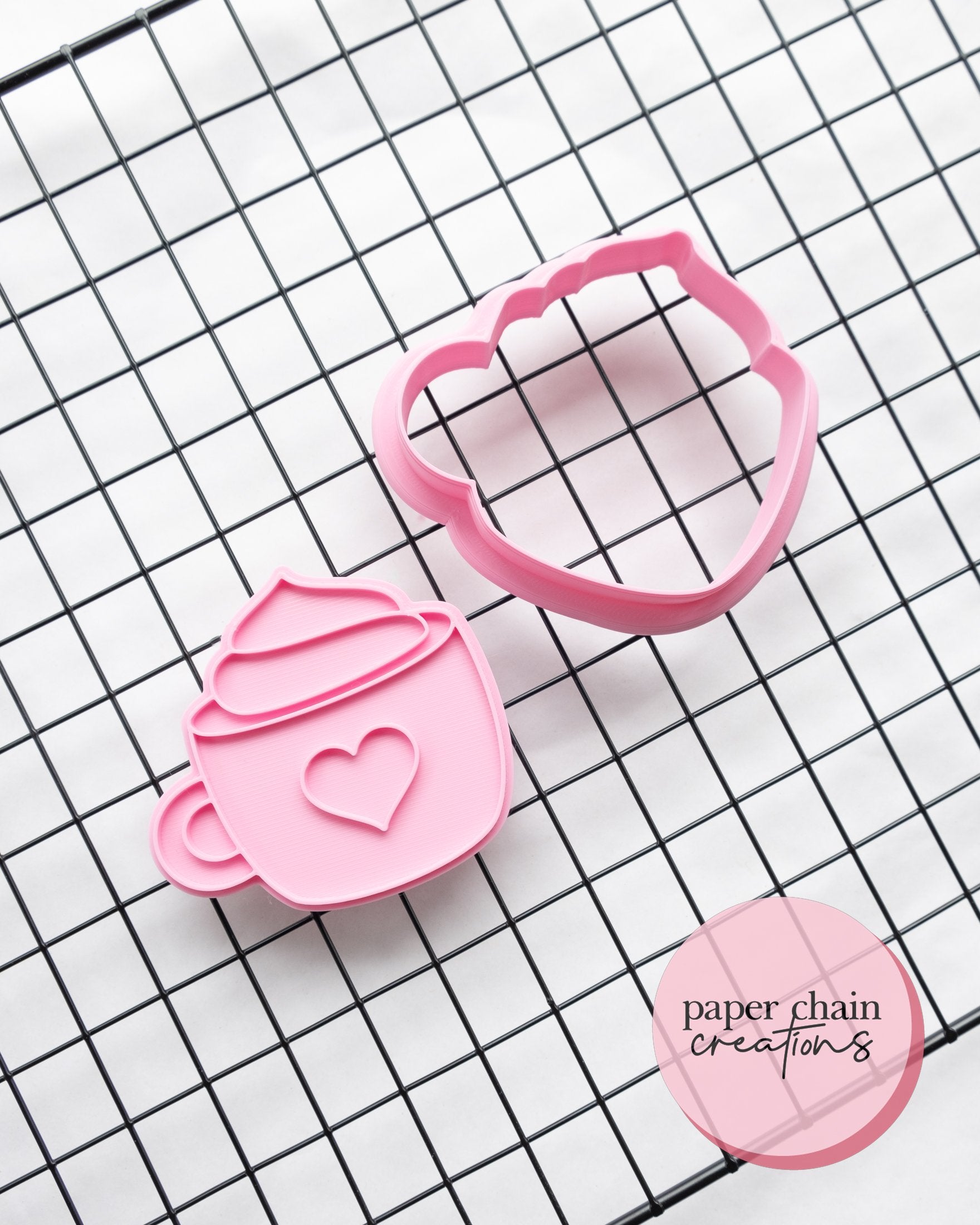 1 x Love Hot Chocolate Mug Cookie Cutter with matching embosser. Embosser comes with handle on the back for ease of use.