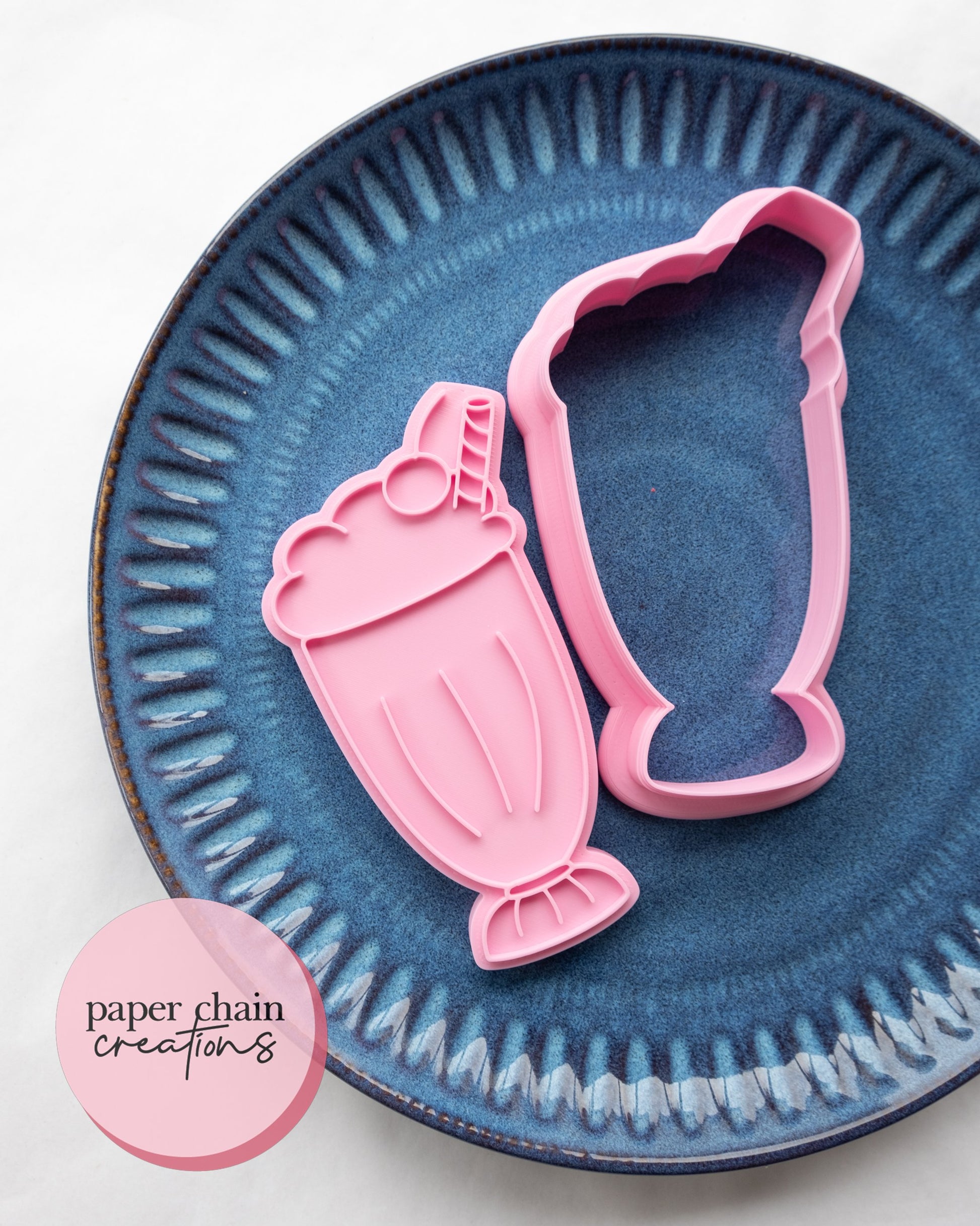 1 x Milkshake cookie cutter with matching embosser. Embosser comes with handle on the back for ease of use.