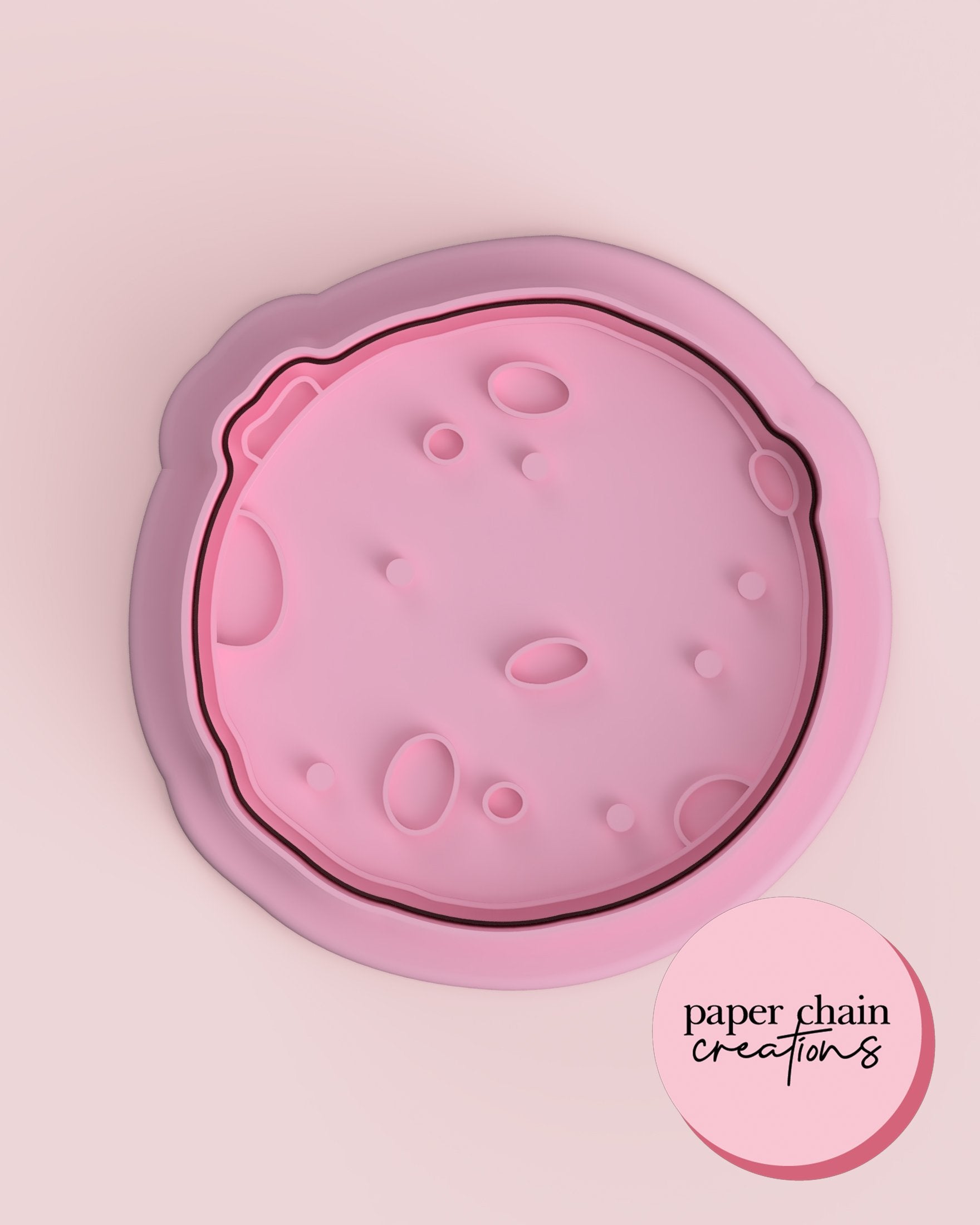 1 x Moon Cookie Cutter with matching embosser. Embosser comes with handle on the back for ease of use.
