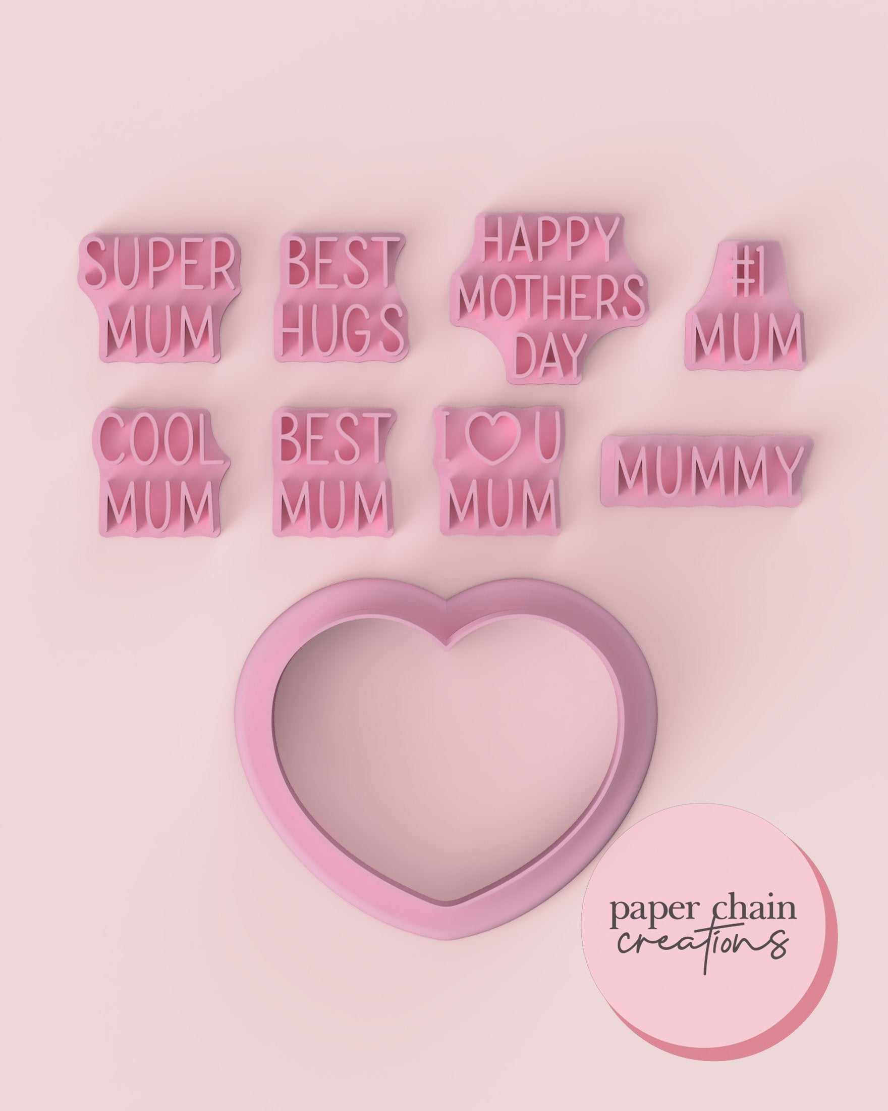 1 x 6cm heart cookie cutter with 8 text embossers. Embossers are best used on our sticky pad stamp holder.