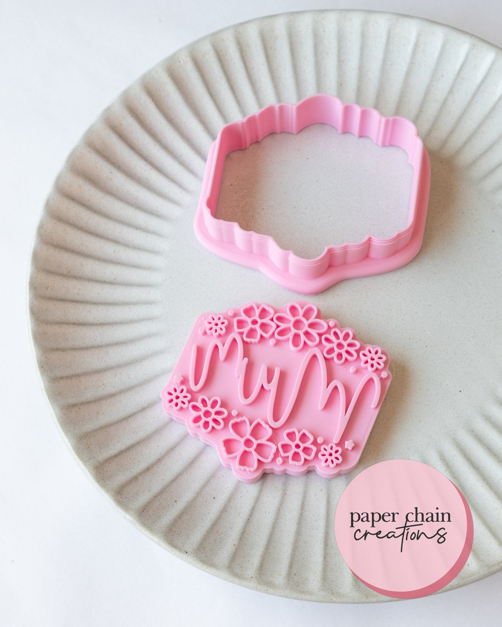1 x Mum Wreath cookie cutter with matching embosser. Embosser comes with handle on the back for ease of use.