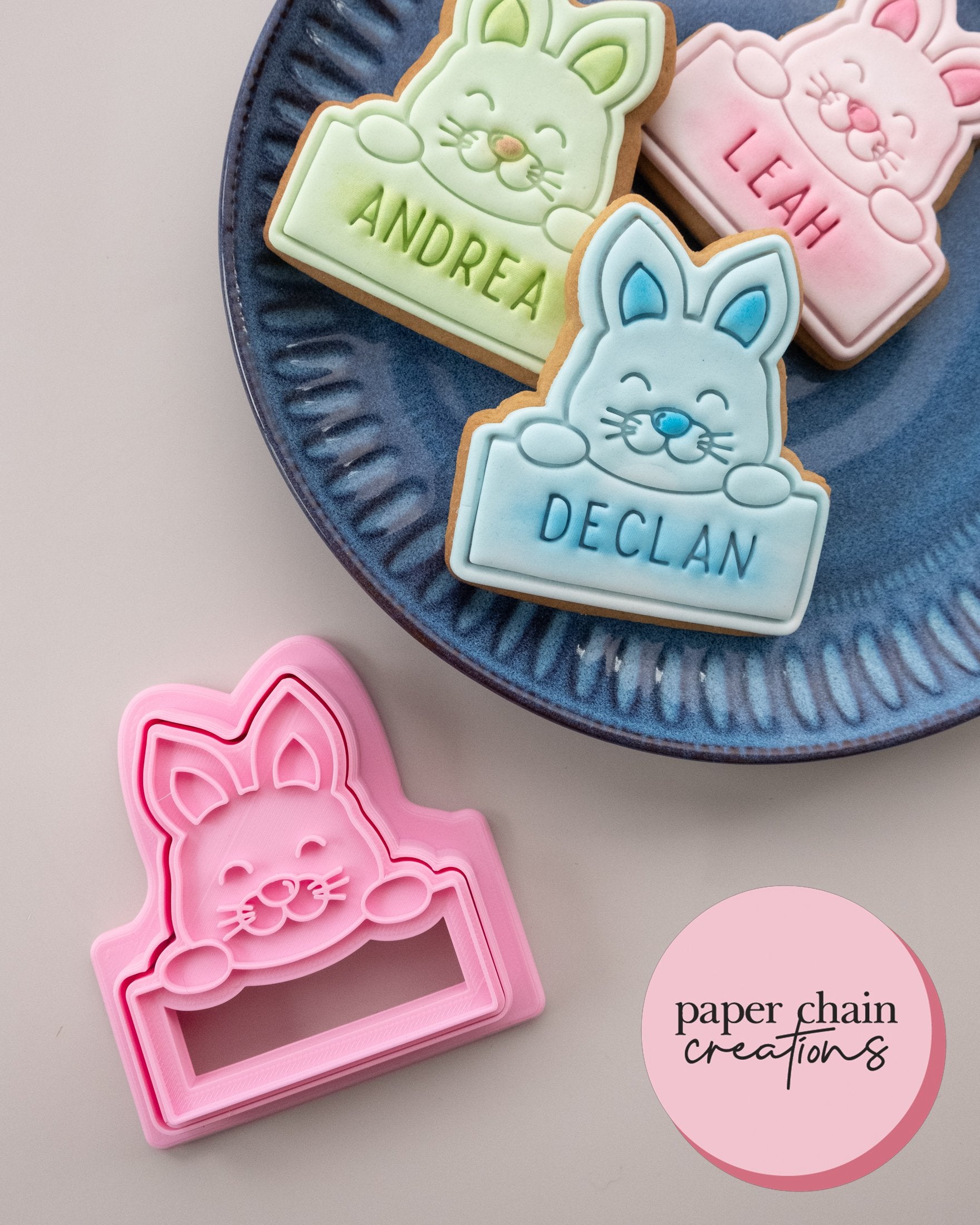 1 x Pointy Ear Bunny Plaque Cutter with matching embosser. Embosser comes with handle on the back for ease of use.