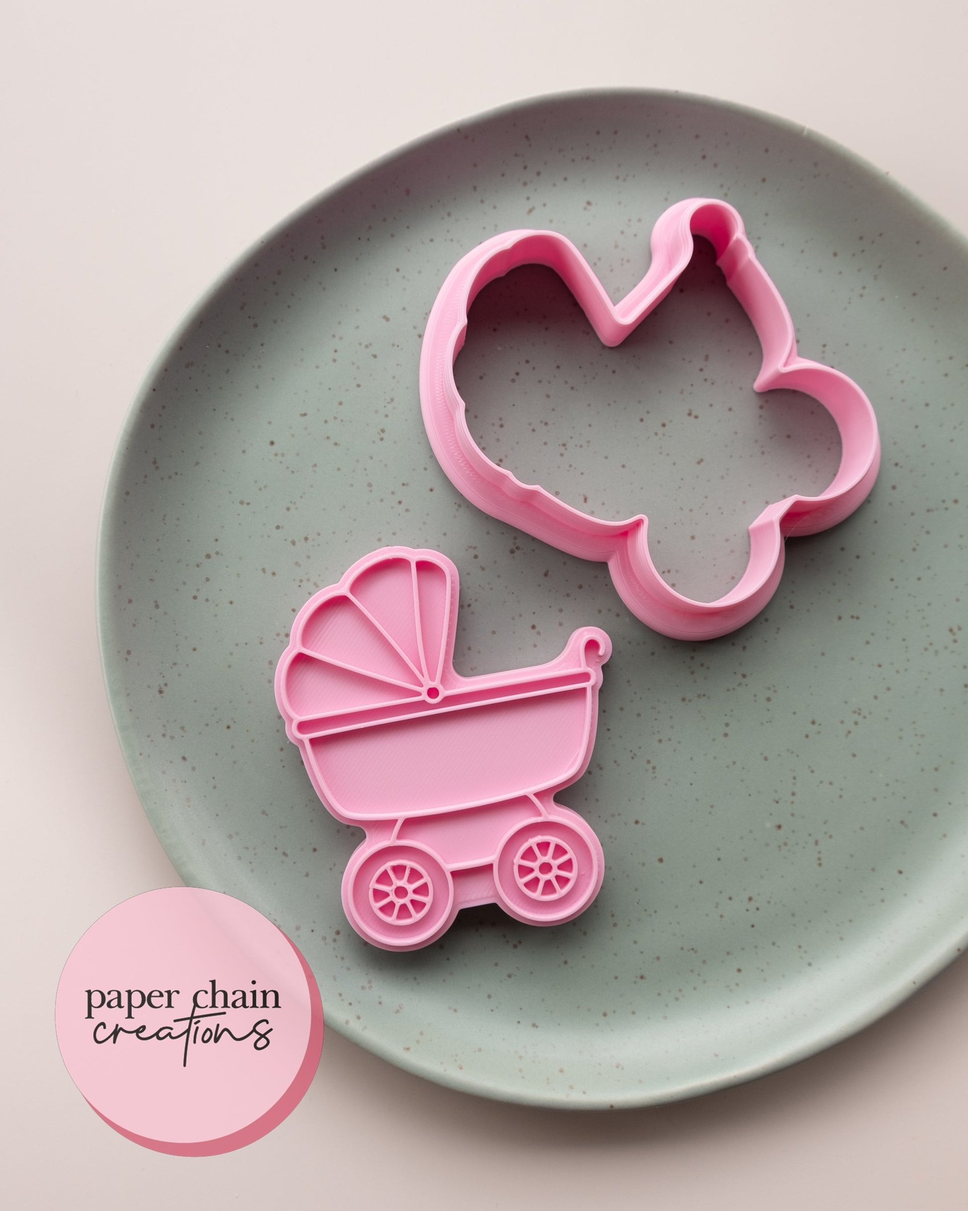 1 x Pram Cookie Cutter with matching embosser. Embosser comes with handle on the back for ease of use.