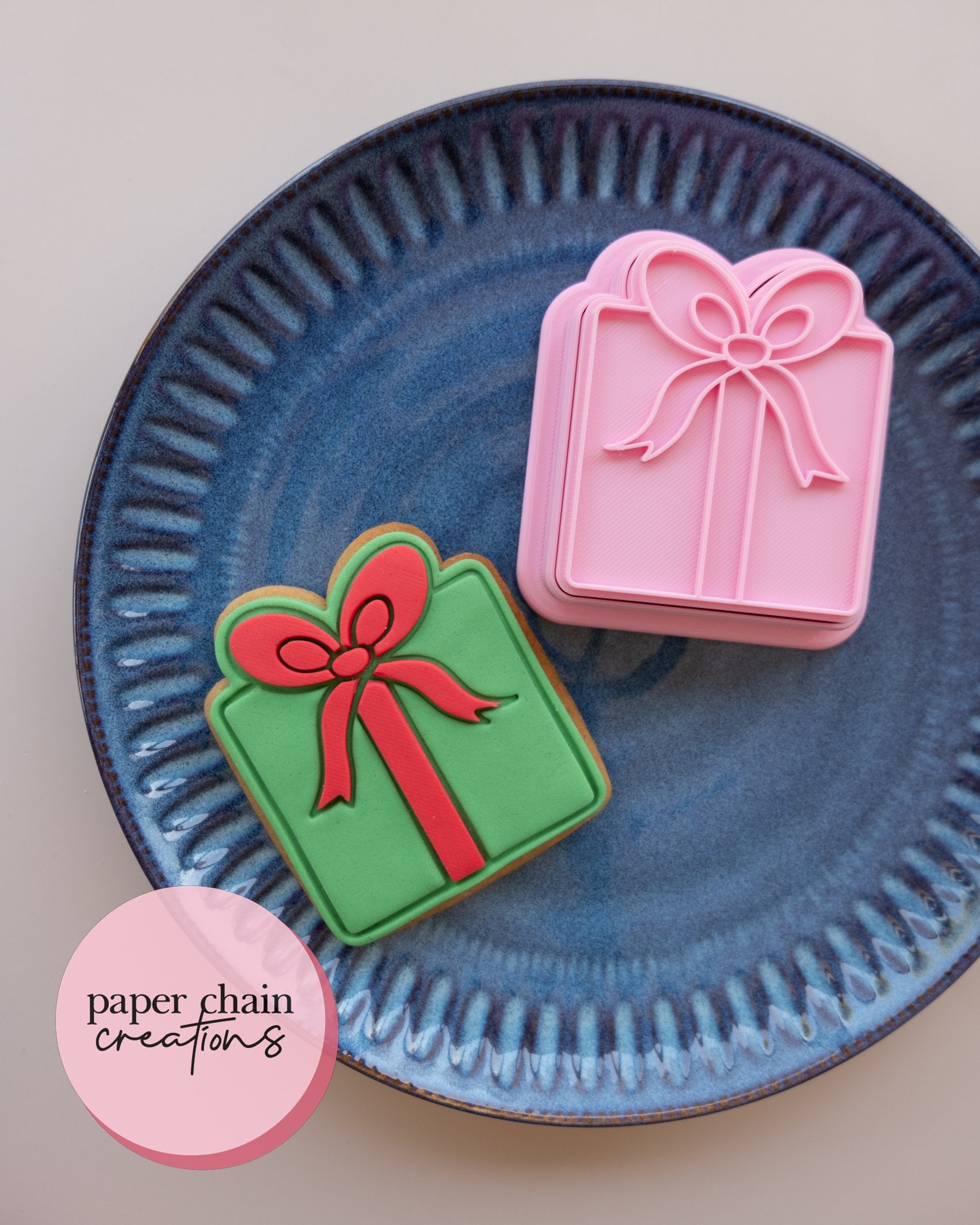 1 x Present cookie cutter with matching embosser. Embosser comes with handle on the back for ease of use.
