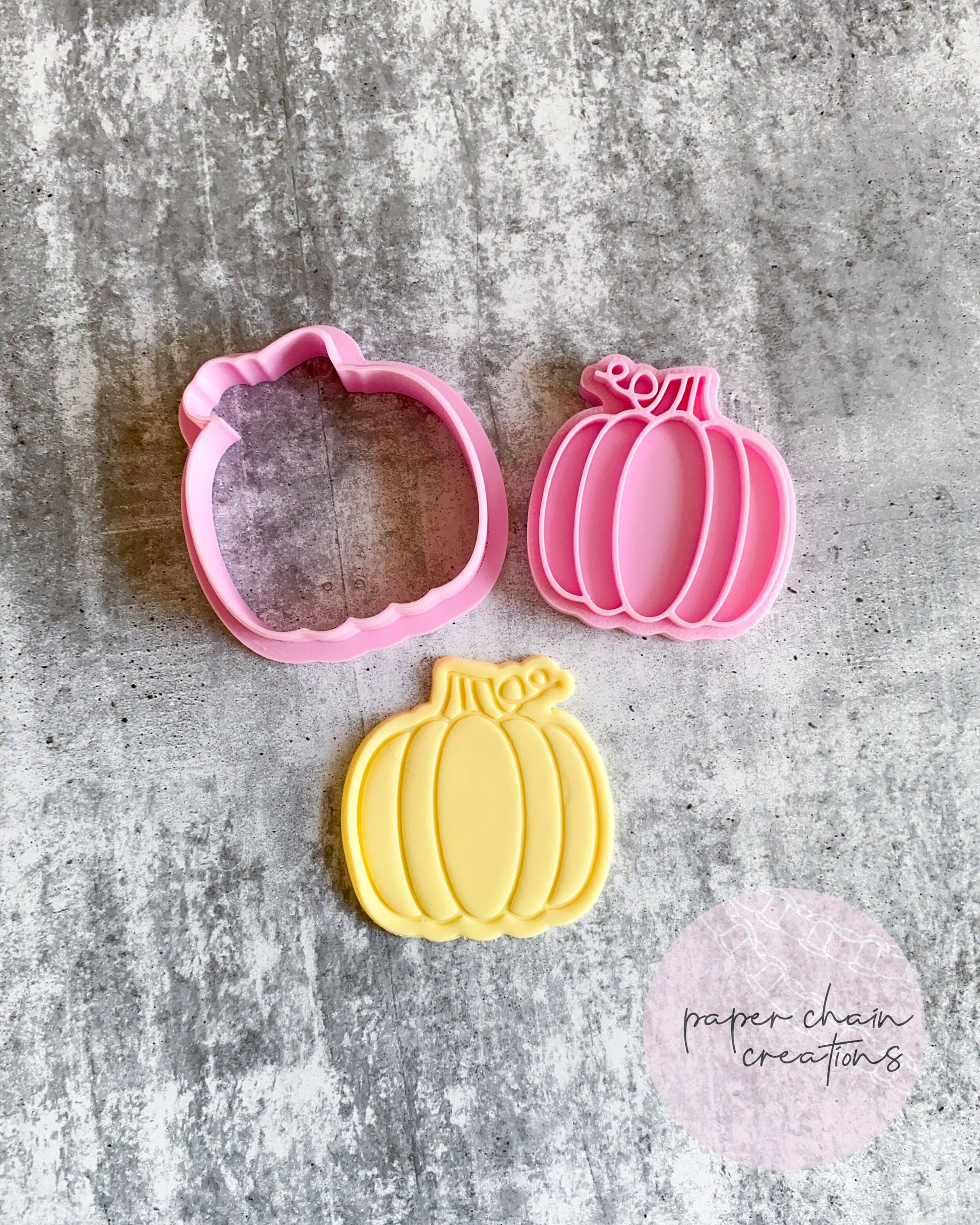 1 x Pumpkin cookie cutter with matching embosser. Embosser comes with handle on the back for ease of use.