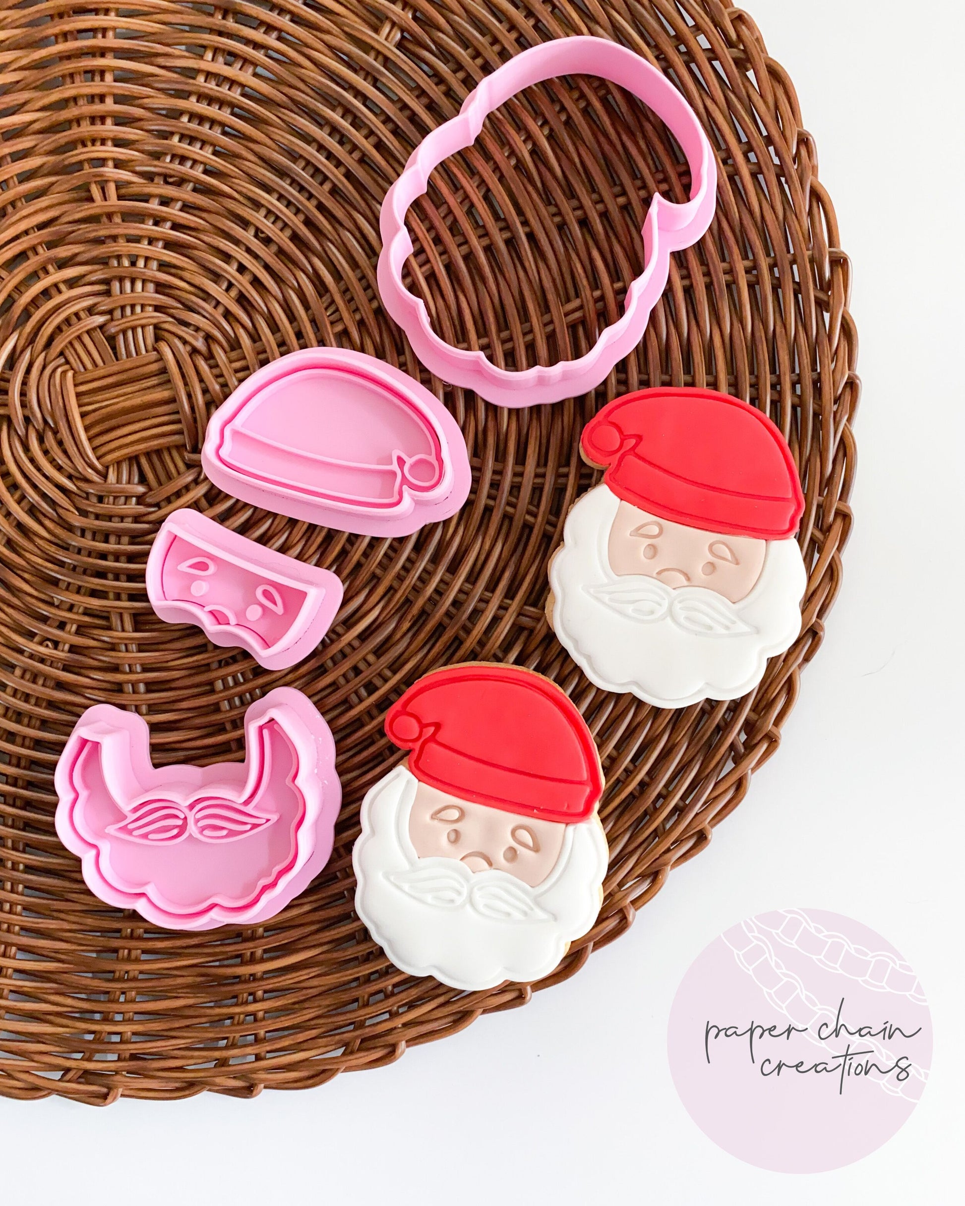 1 x Santa face outline cookie cutter and 3 x Santa face pieces cookie cutters with matching embossers. Embosser comes with handle on the back for ease of use.