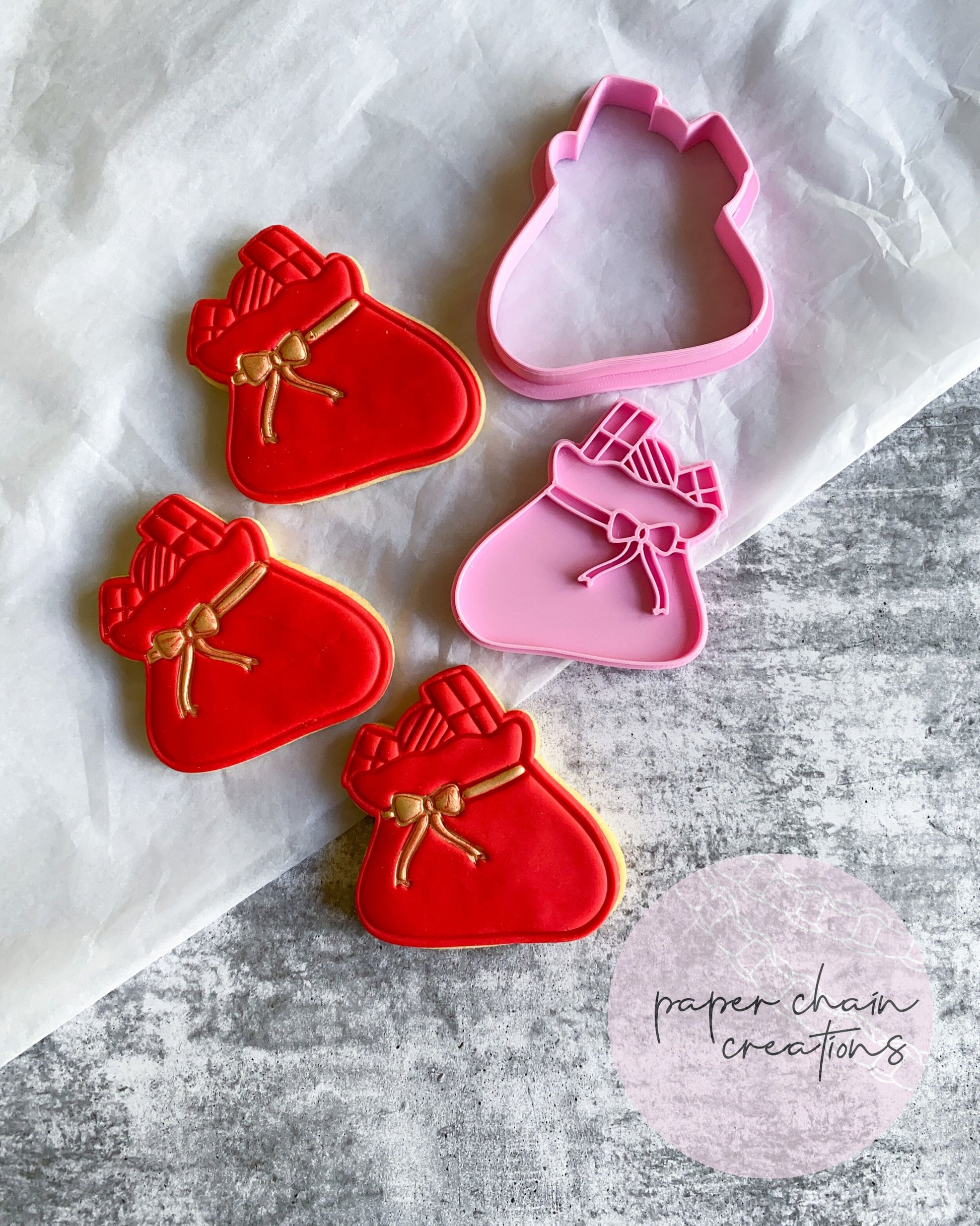 1 x Santa Sack cookie cutter with matching embosser. Embosser comes with handle on the back for ease of use.
