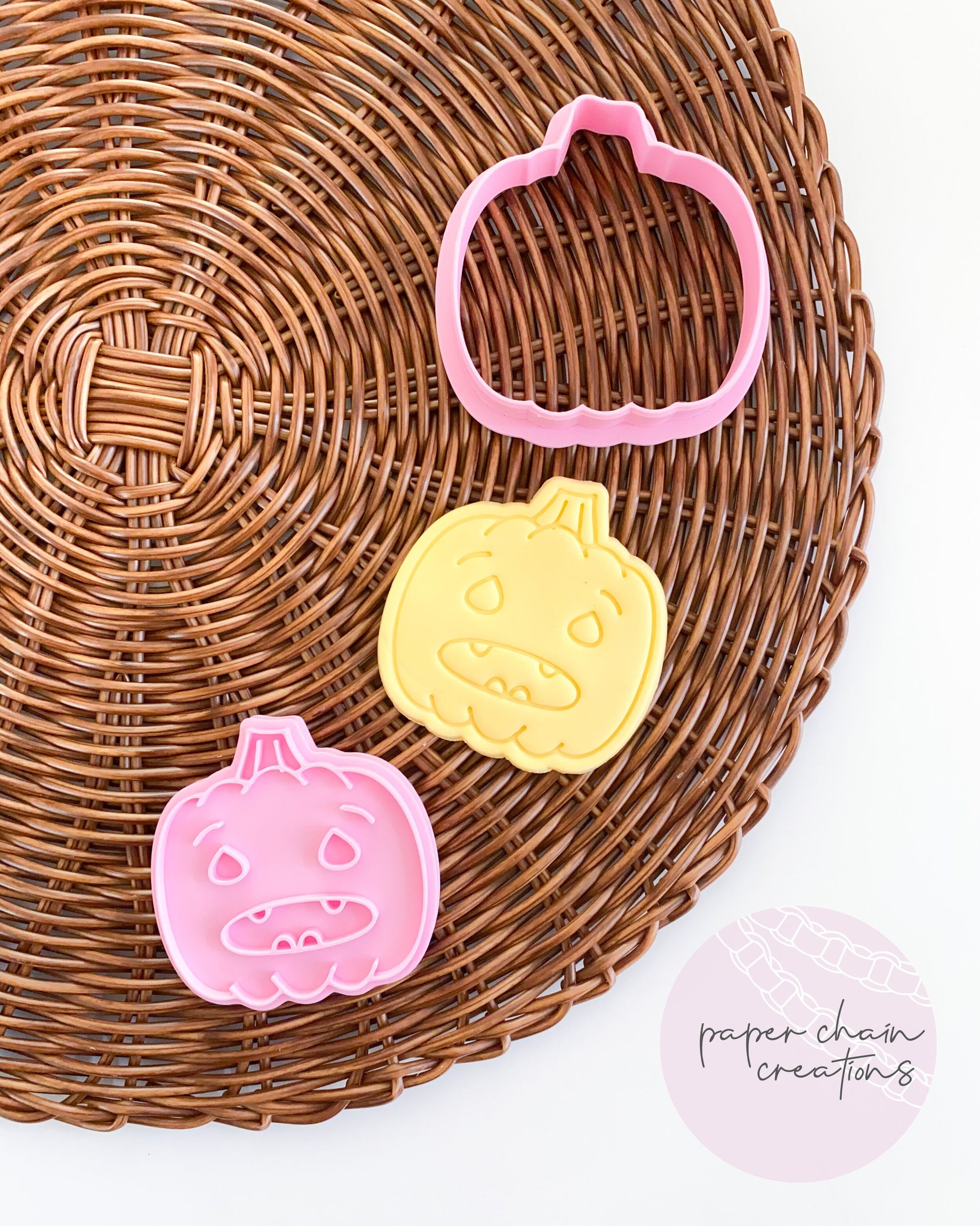 1 x Scaredy-Cat Pumpkin cookie cutter with matching embosser. Embosser comes with handle on the back for ease of use.