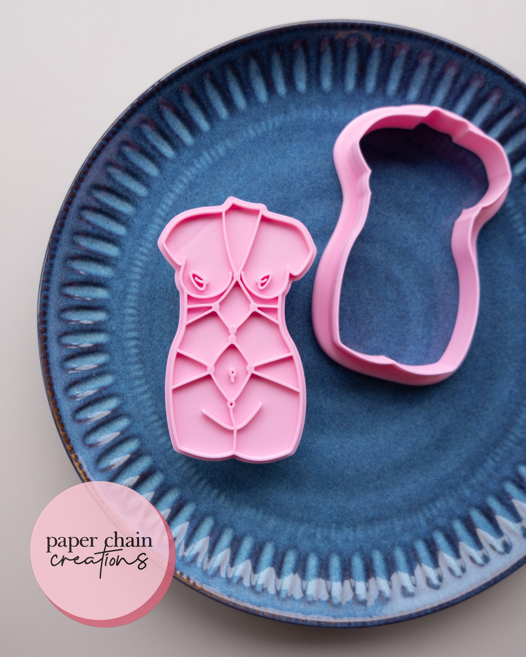 1 x Shibari Cookie Cutter with matching embosser. Embosser comes with handle on the back for ease of use.