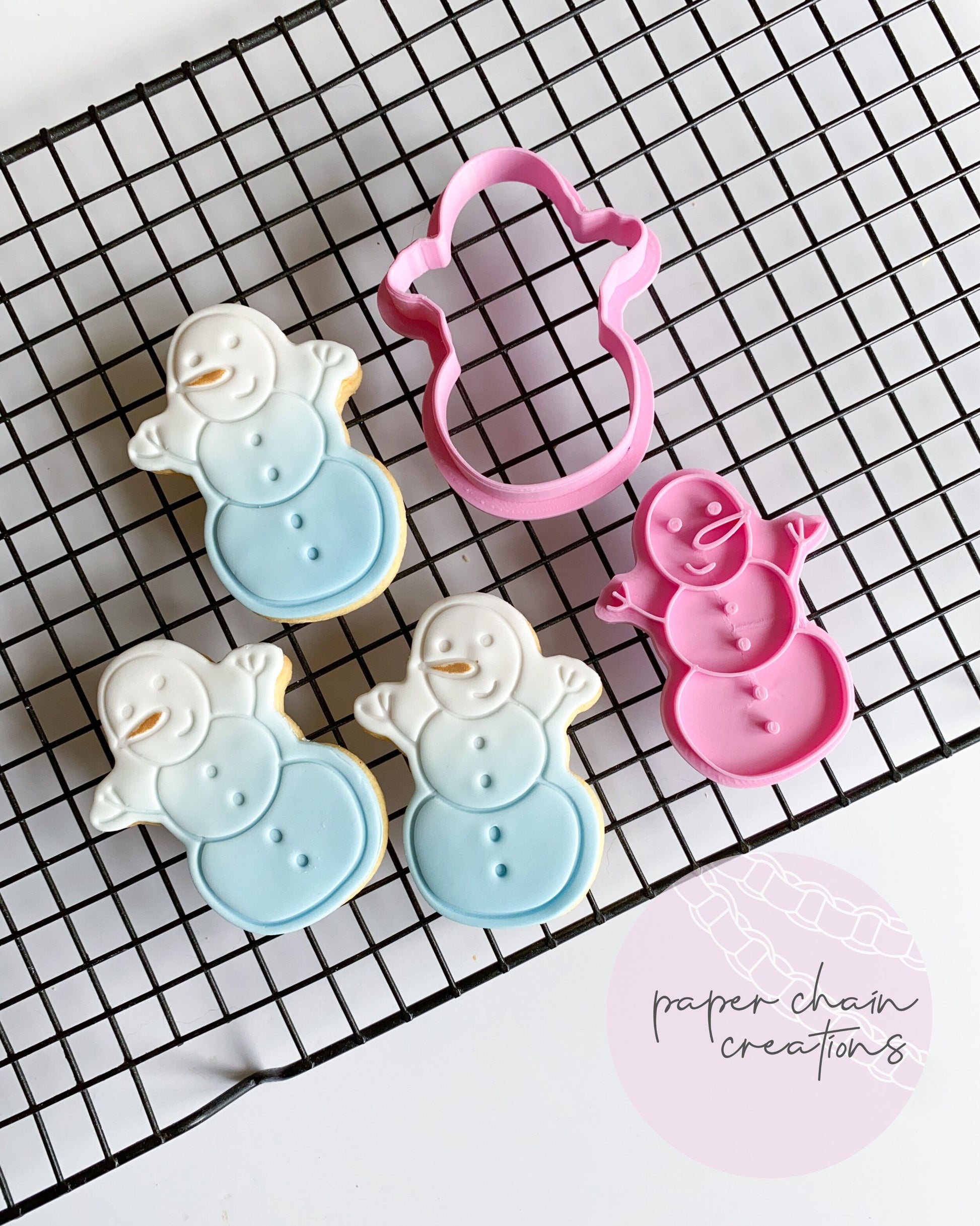 1 x Snowman cookie cutter with matching embosser. Embosser comes with handle on the back for ease of use.