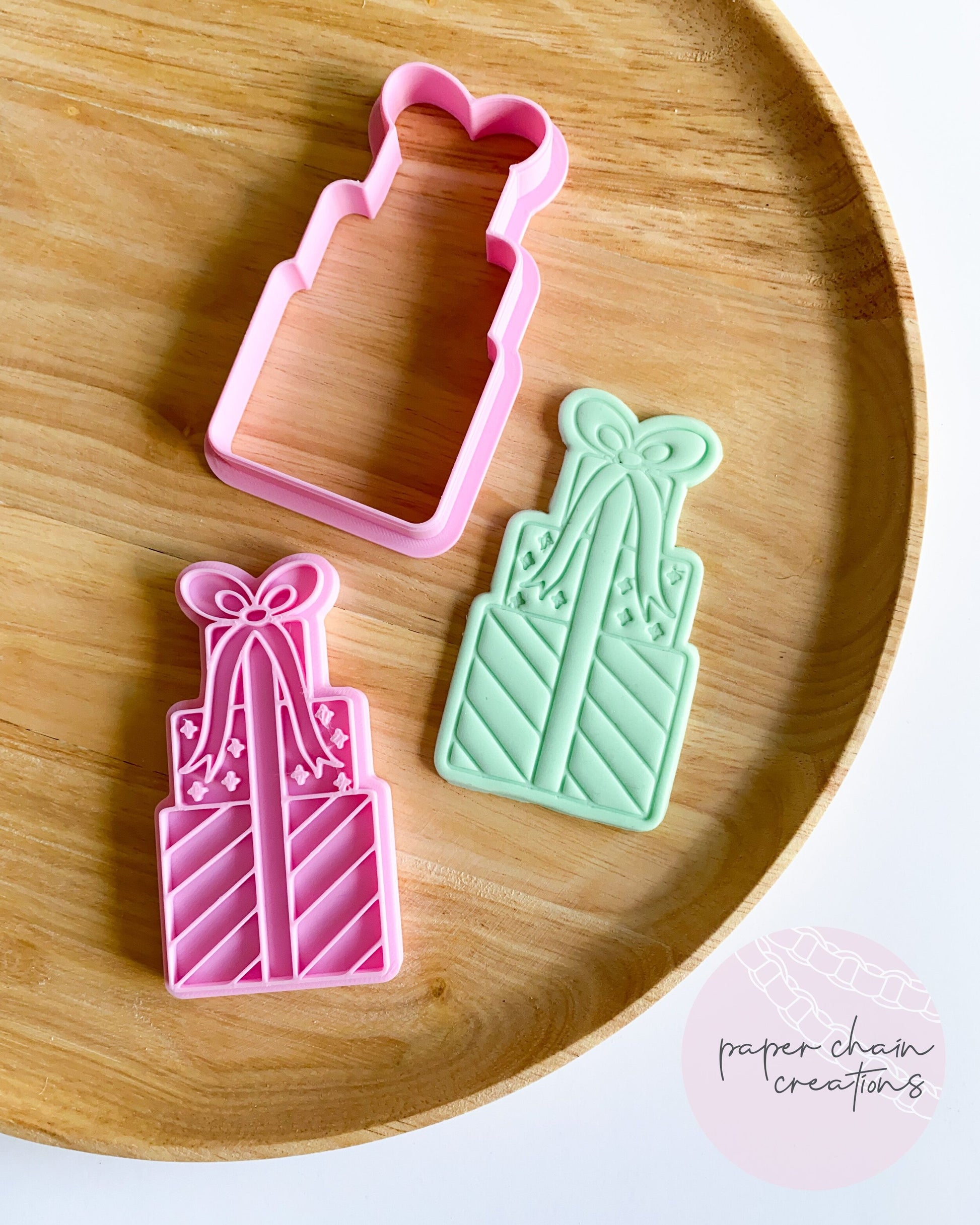 1 x Stack of Presents cookie cutter with matching embosser. Embosser comes with handle on the back for ease of use.