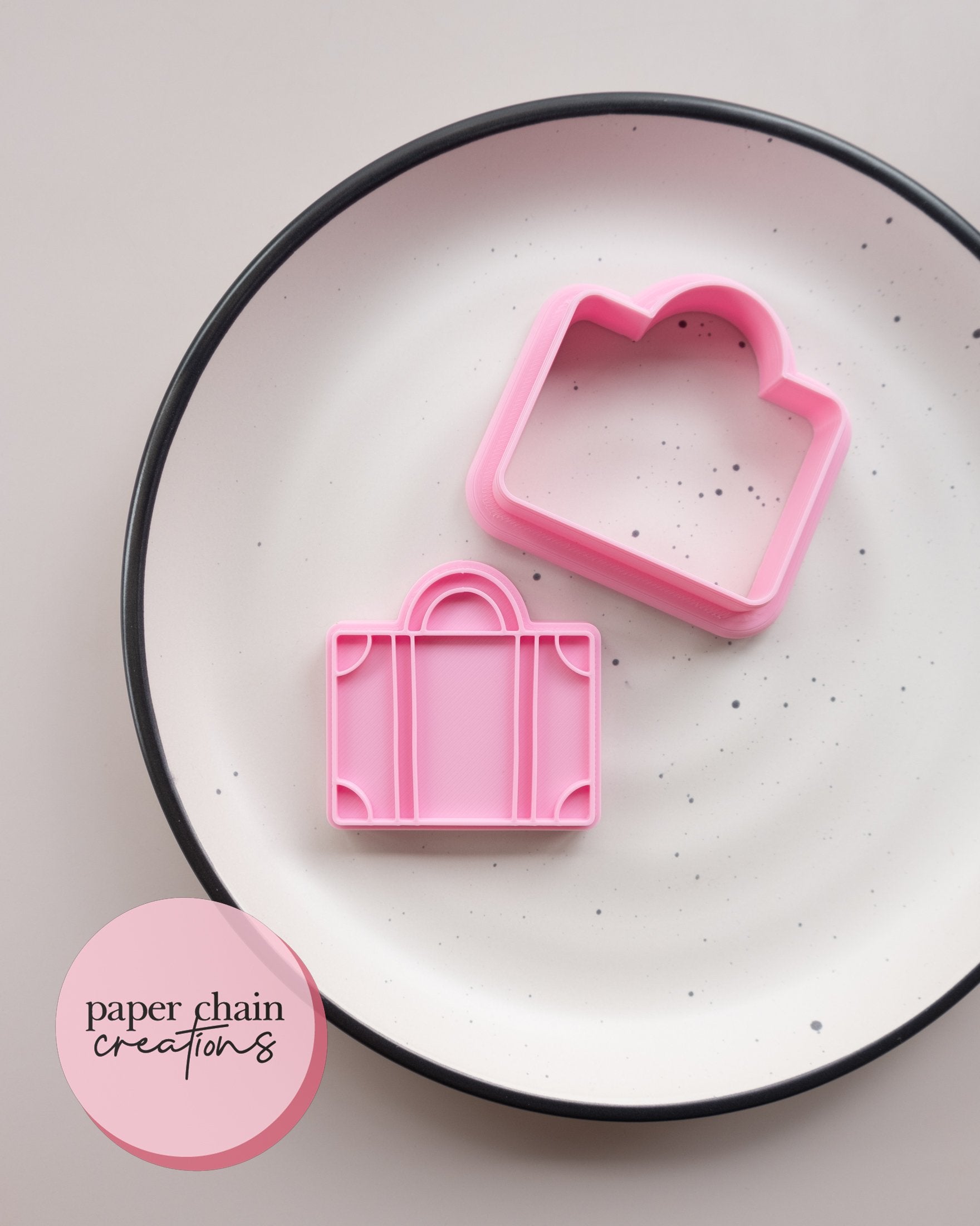 1 x Suitcase Cookie Cutter with matching embosser. Embosser comes with handle on the back for ease of use.