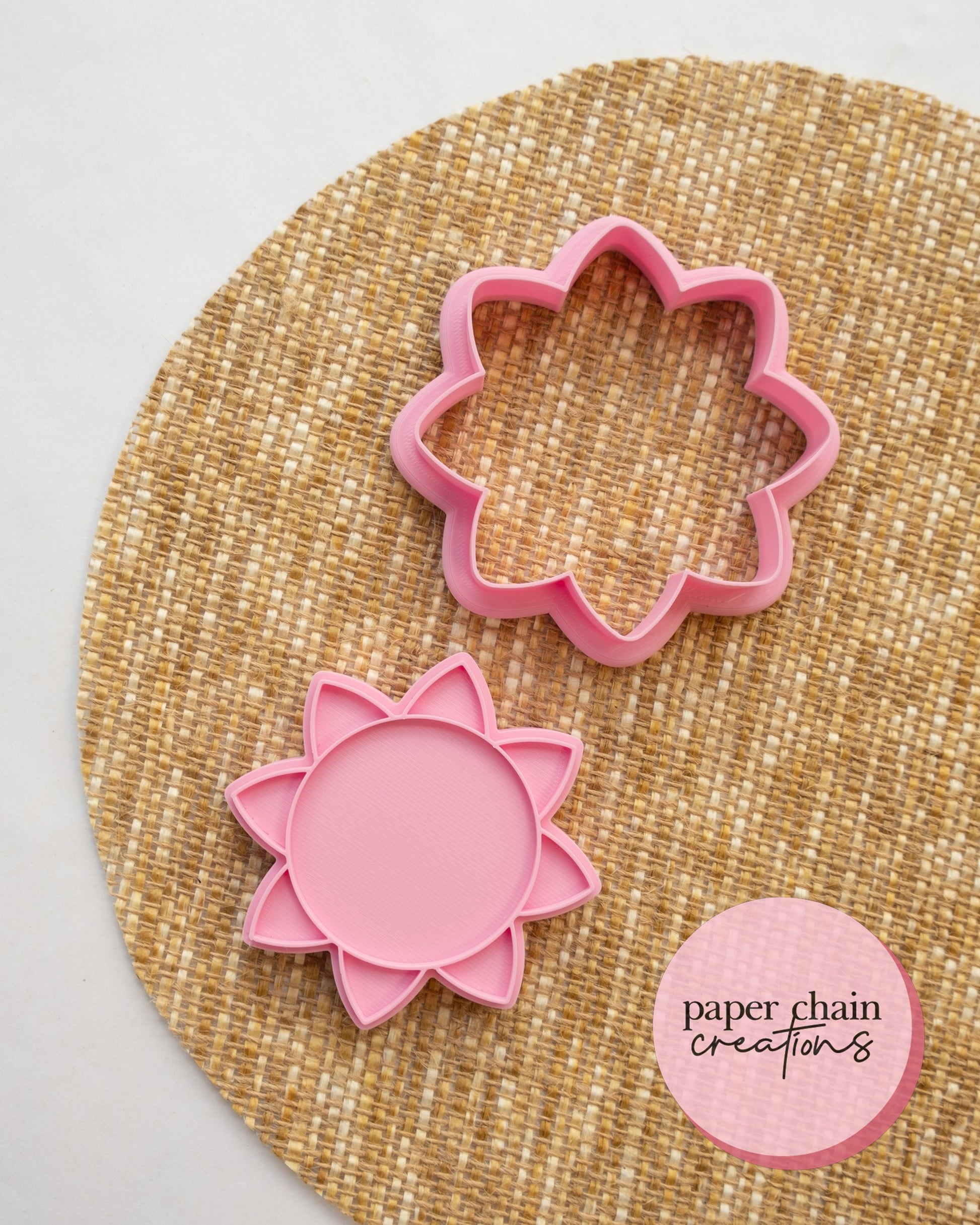 1 x Sun Cookie Cutter with matching embosser. Embosser comes with handle on the back for ease of use.