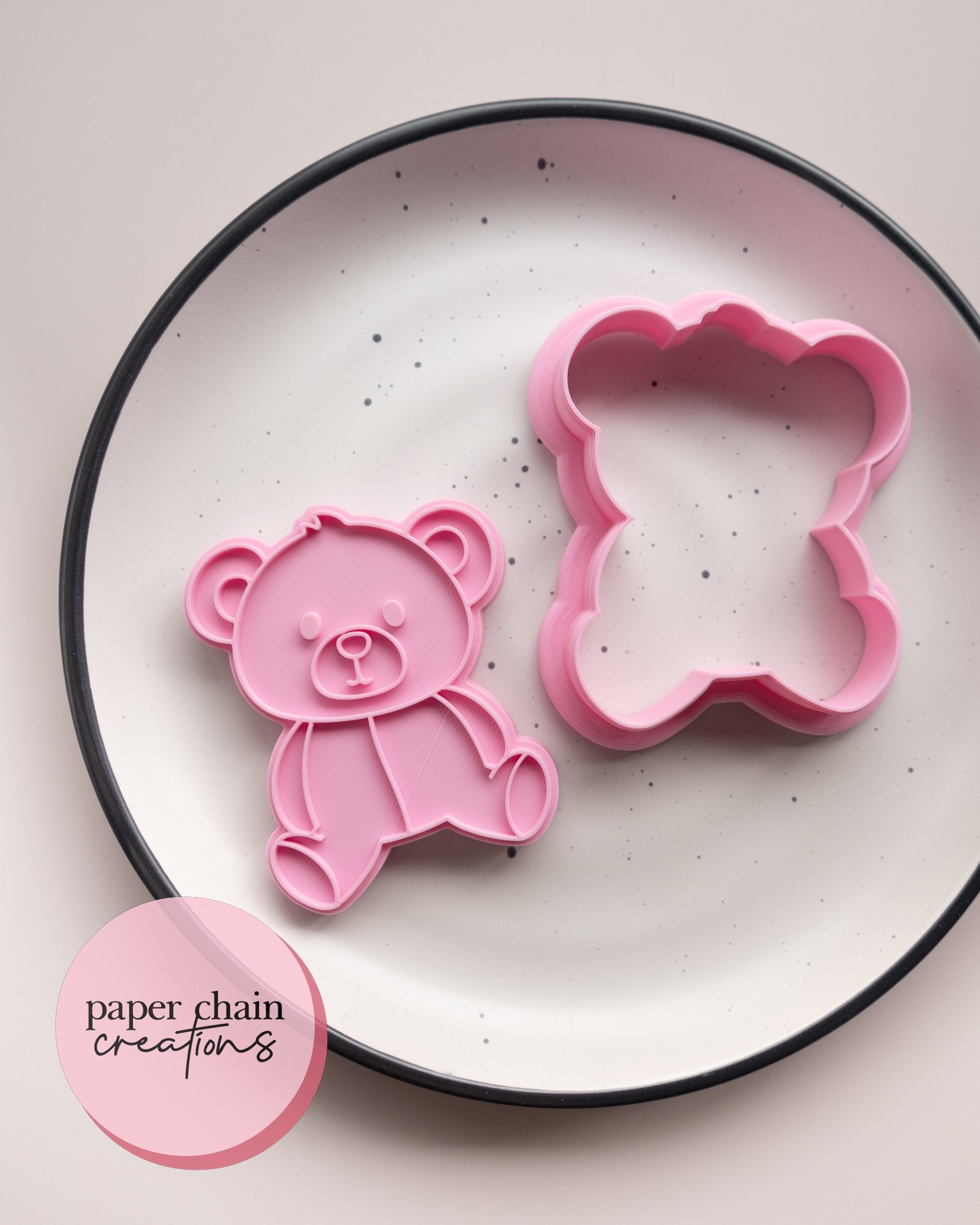 1 x Teddy V2 Cookie Cutter with matching embosser. Embosser comes with handle on the back for ease of use.