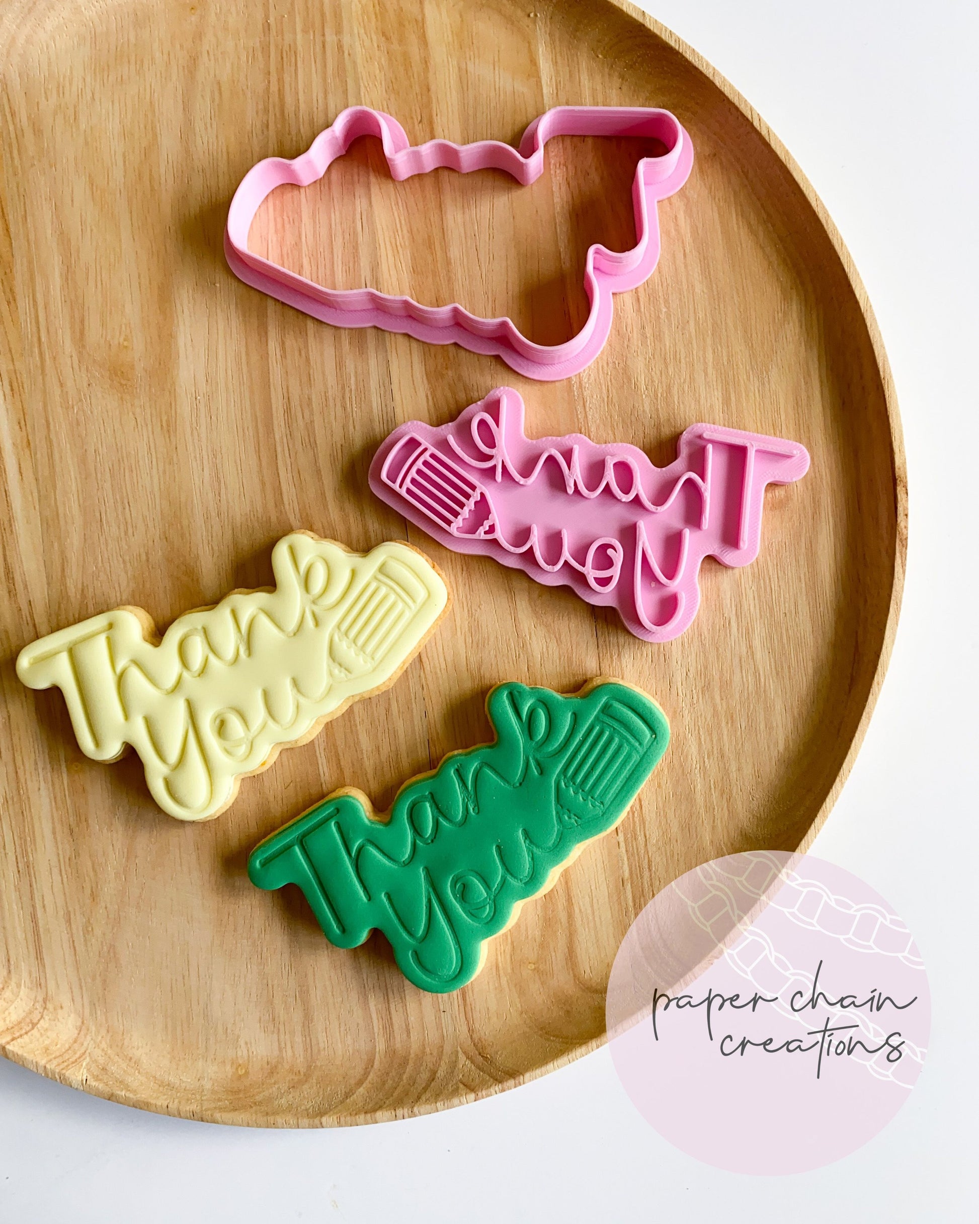 1 x Thank you Embosser with matching cutter. Embosser comes with handle on the back for ease of use.