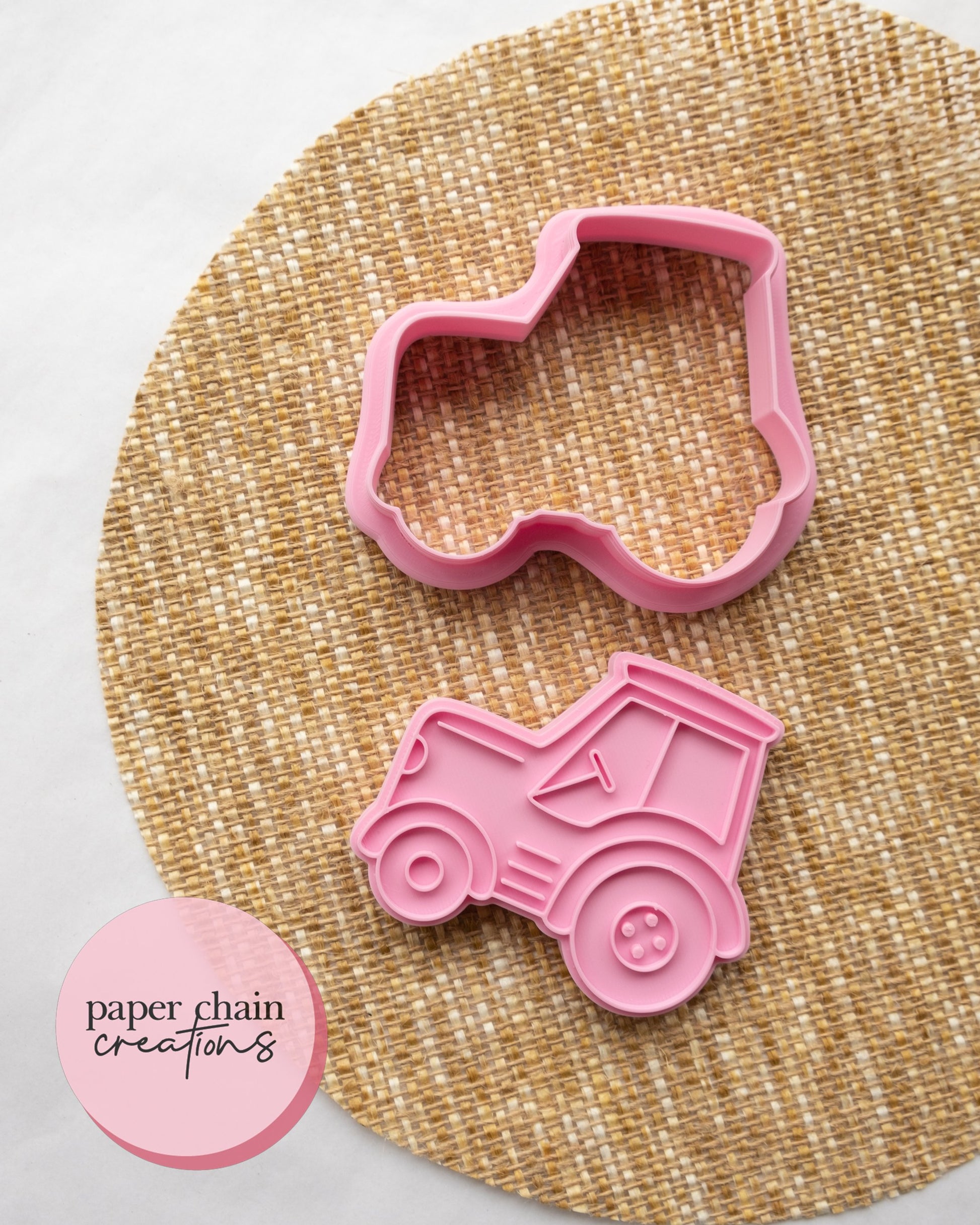 1 x Tractor Cookie Cutter with matching embosser. Embosser comes with handle on the back for ease of use.