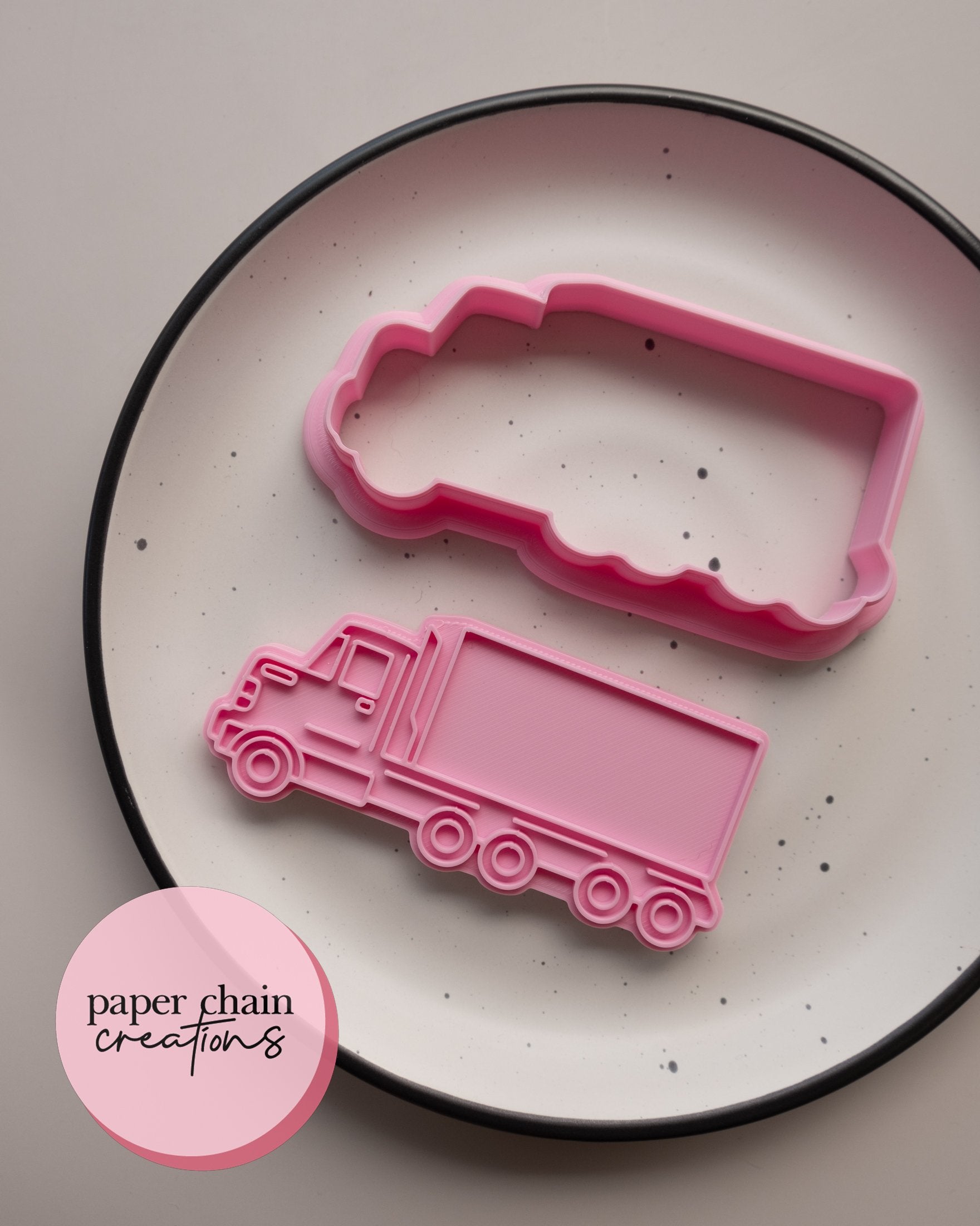 1 x Transport Truck cookie cutter with matching embosser. Embosser comes with handle on the back for ease of use.