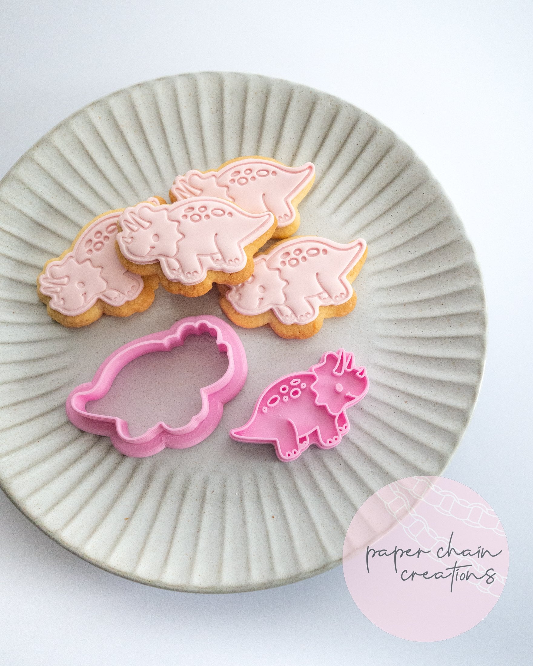 1 x Triceratops Cookie Cutter with matching embosser. Embosser comes with handle on the back for ease of use.
