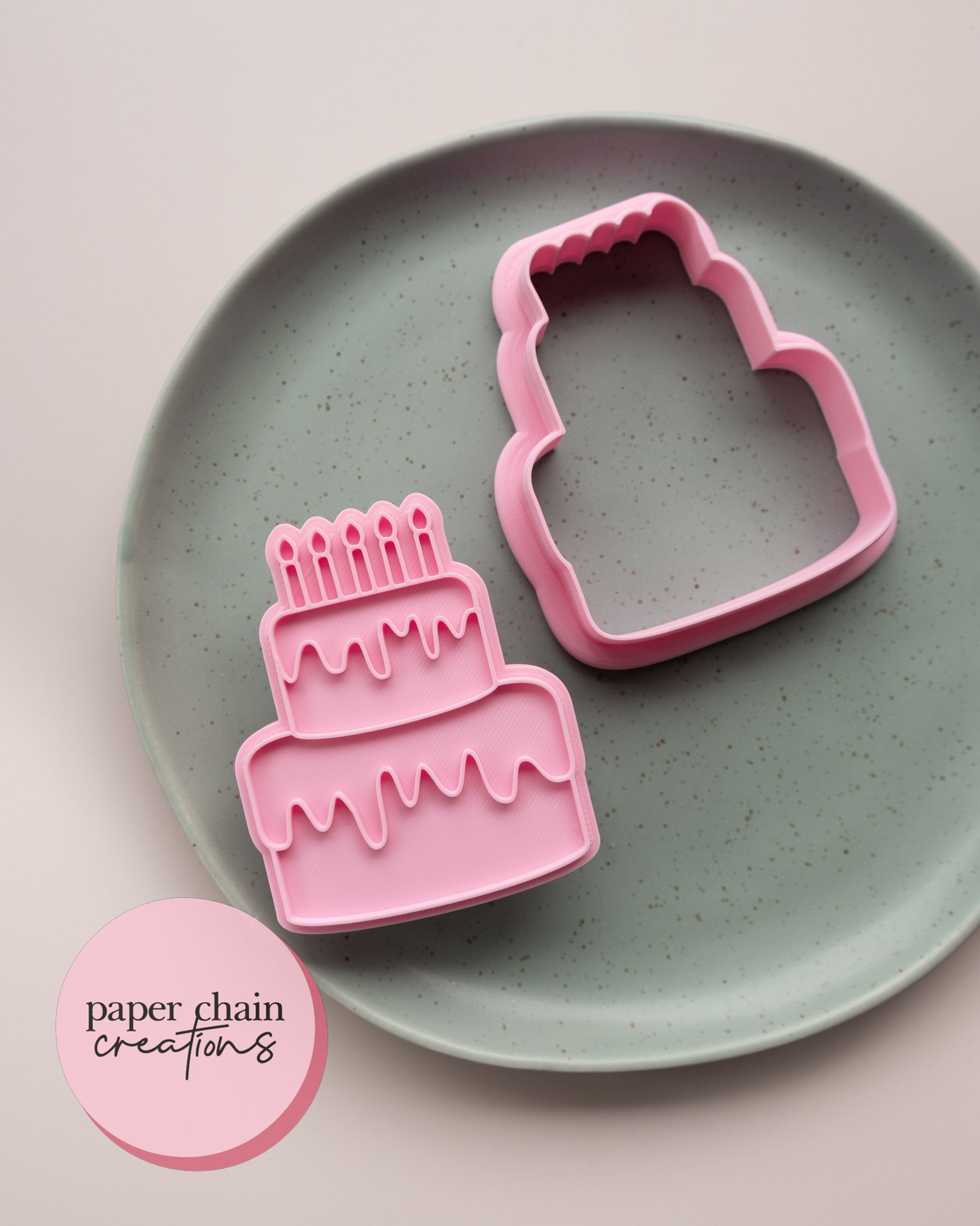 1 x Two Tier Drip Cake cookie cutter with matching embosser. Embosser comes with handle on the back for ease of use.