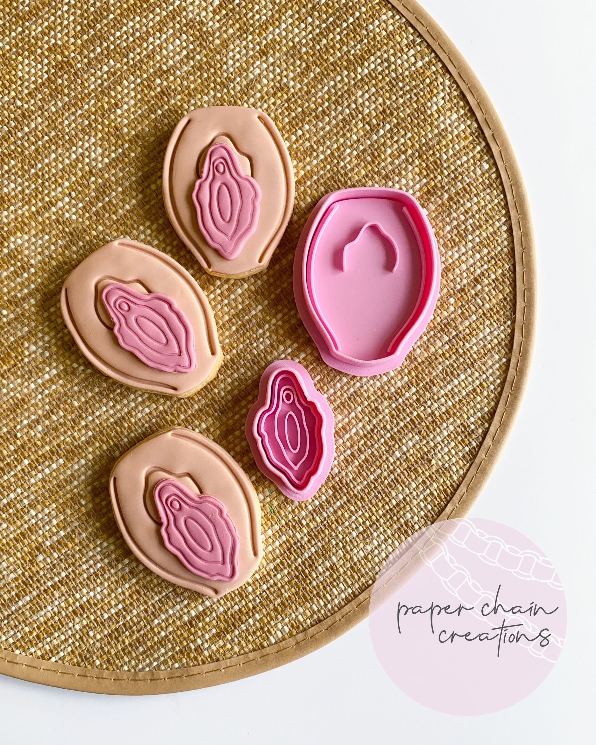 1 x Vagina outline cookie cutter, 2 x Vagina embossers and one cutter for the smaller embosser. Embosser comes with handle on the back for ease of use.