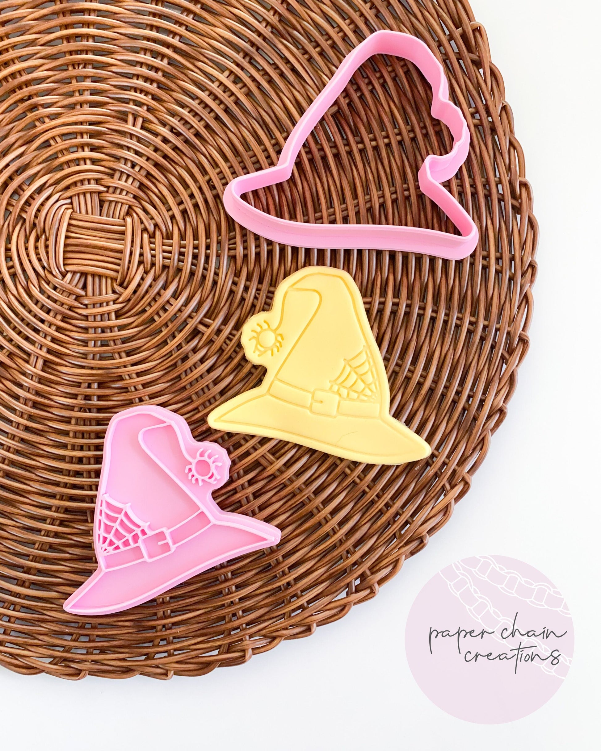 1 x Witches Hat cookie cutter with matching embosser. Embosser comes with handle on the back for ease of use.